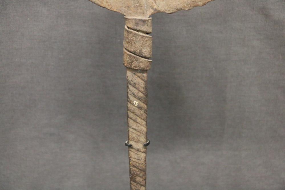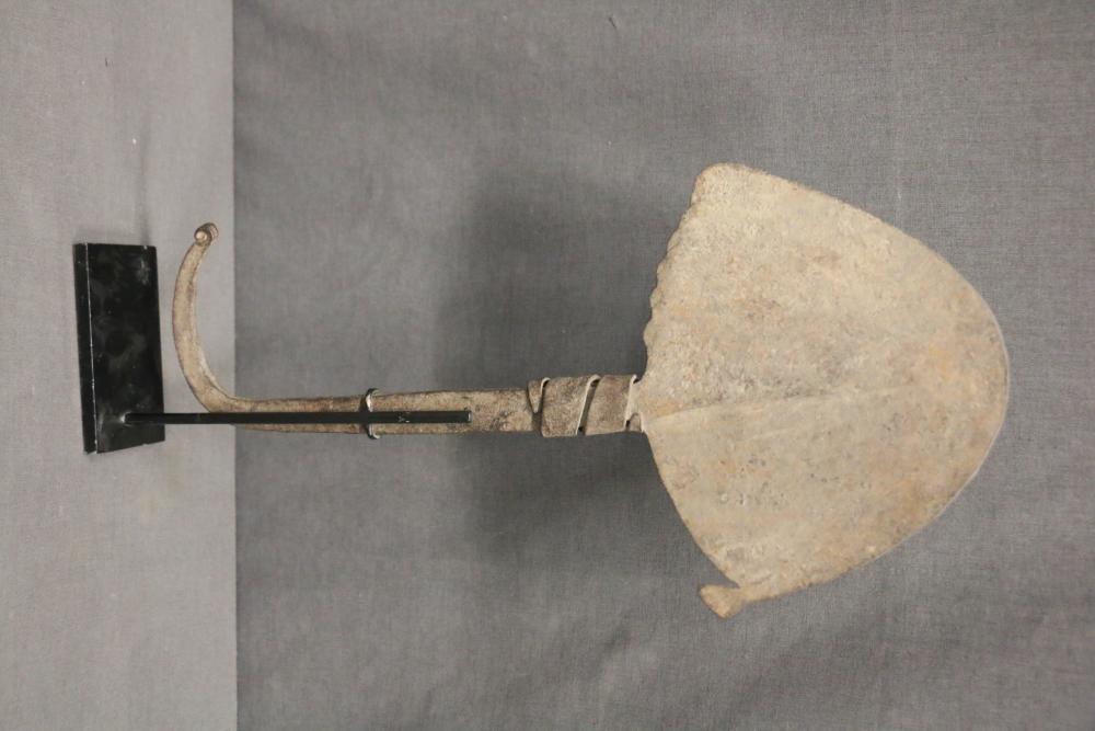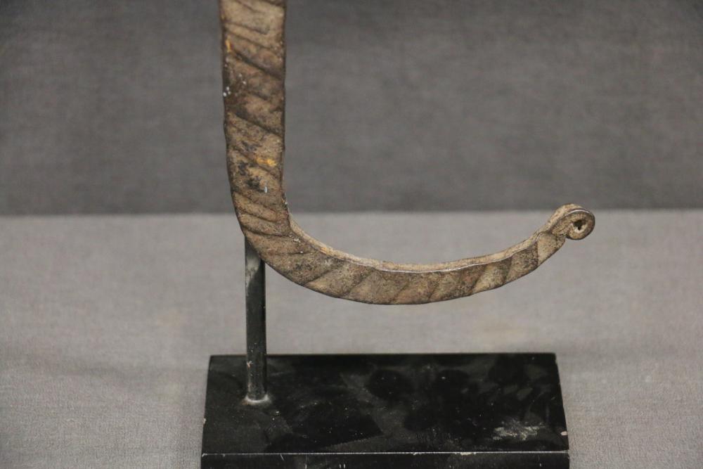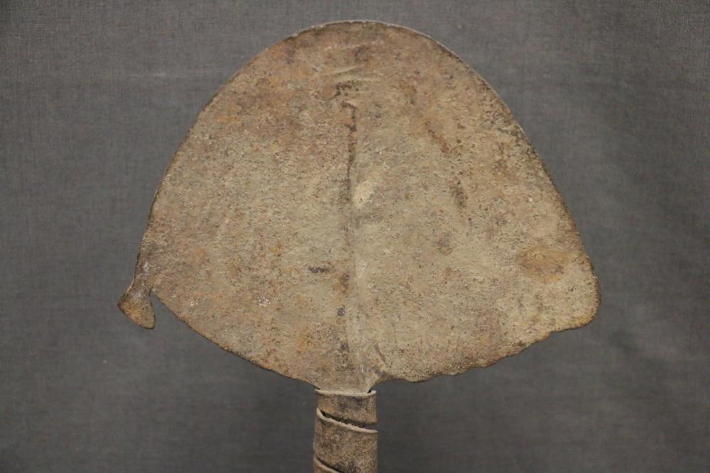 BANDAKA “JELLYFISH” FORM CURRENCY. Mambila and Chamba people, Cameroon. The semi-oval blade is divided into 2 sections separated by a narrow spine that arises from the handle. The lower edge of one half of the blade is rippled and a knob protrudes from the other half. The upper third of the handle just below the blade is wrapped with an iron band, presumably to add greater importance to the object. The lower end of the shaft is curved like an umbrella handle. The name, Bandaka, comes from the name of a small village where these objects were first found by explorers around 1900, but it is not known if these objects are produced in this village, On custom base. Hand forged iron. H 16in. Ex Roberto Ballarini collection, Milan Italy.