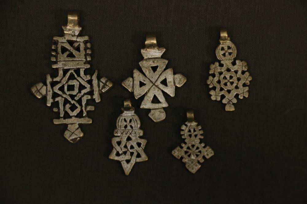 PENDANTS (5). Coptic Christian people, Ethiopia. Four variants of cross form and one star. Silver-nickel alloy. 1.5in-3in.