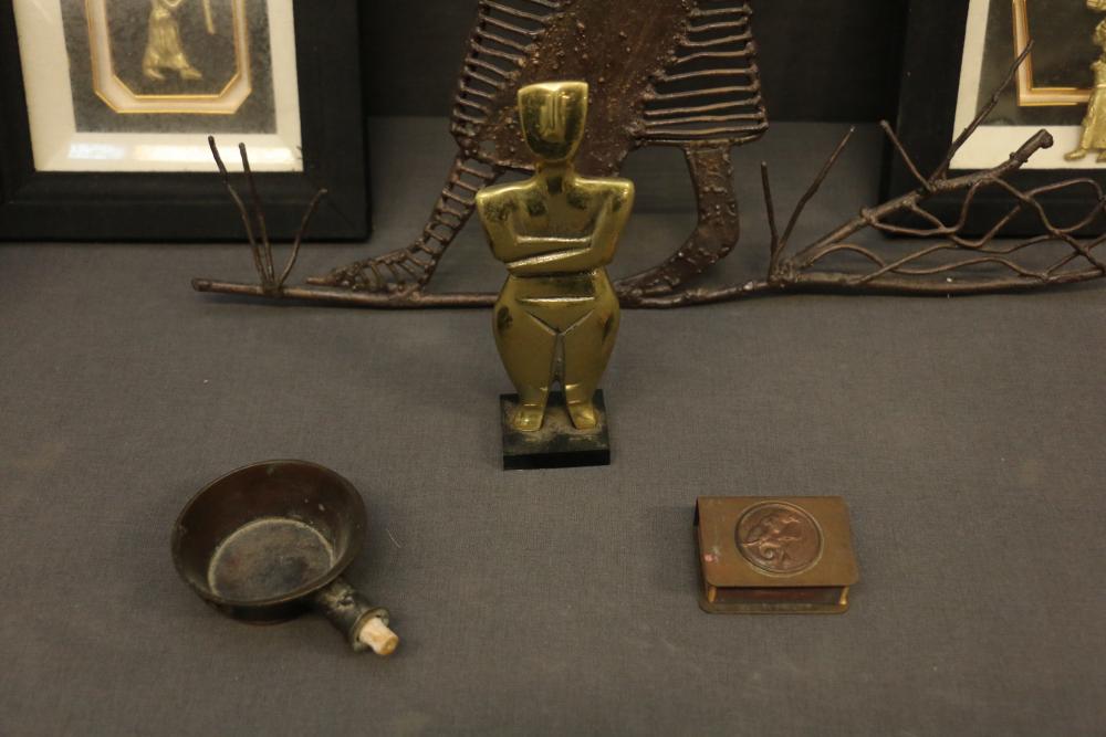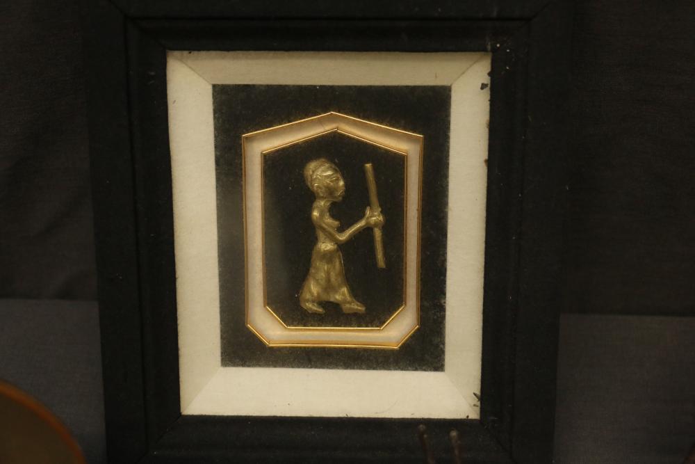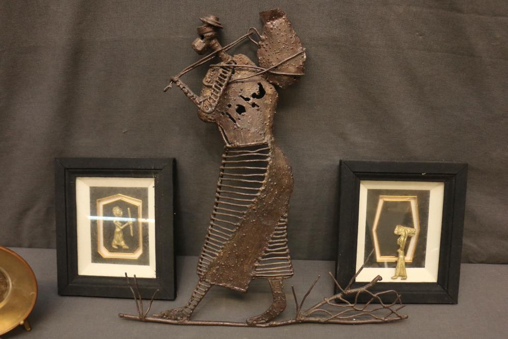 Over 170 lots of African art. Items include women's indigo wraps. Marka/Dafing people, Burkina Faso; Dan headdress, Liberia; large carved Mali-style African drum; old currency spears. Tuareg people, Mali & Niger; rod puppet head of Dankalankule, the Oryx antelope; Bandaka “jellyfish” form currency. Mambila & Chamba people; pendants, Coptic Christian people, Ethiopia; leg band. Mongo & Konda people, Congo; Koranko body mask, Guinea, Sierra Leone; abstract bogolan textile. Bamana people, Mali; ceremonial snake-form bayonet/knife. Lobi people, Burkina Faso; ceremonial blacksmith’s hammer, Northern Nigeria; wedding blanket. Tuareg people, Niger & Mali; West African heddle pulleys. (A) Senufo people, Ivory Coast; maternity figure. Lokko people, Sierra Leone; male Chi Wara head crest mask. Bamana people, Mali; rare Asafo flag bearer/dancer's skirt. Fante people, Ghana & more. Items are located in Pleasant Valley, NY.