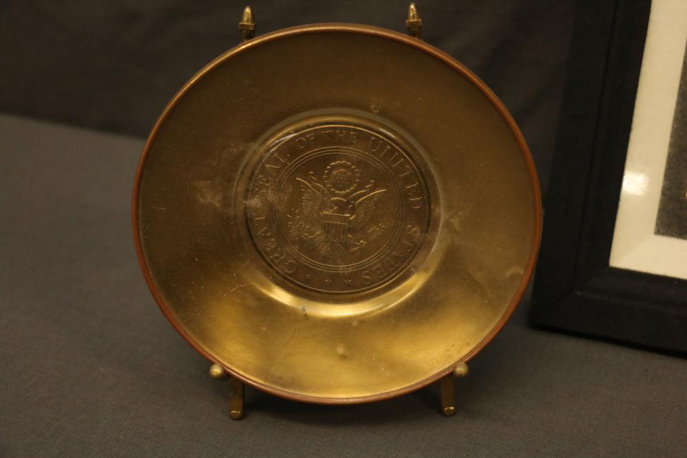 Various items incl pair of matching wall hangings, metal matchbox holder, Chinese bowl, United States Seal display plate.