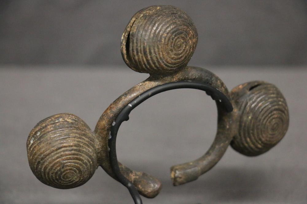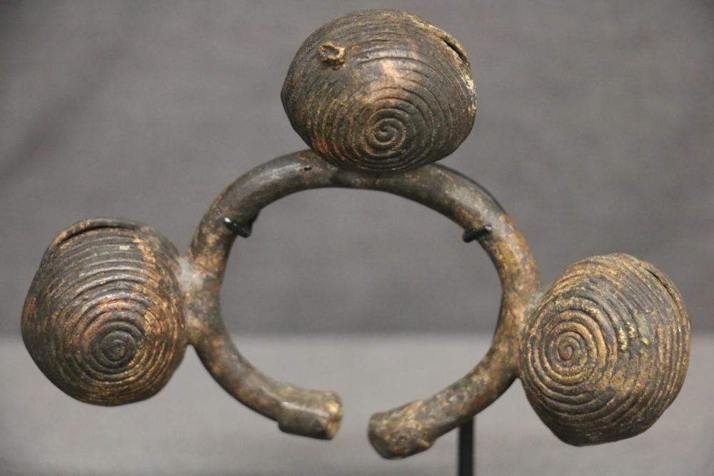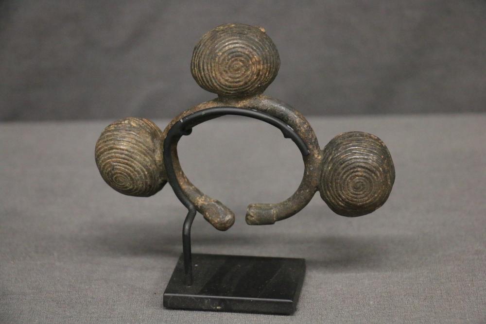 Over 170 lots of African art. Items include women's indigo wraps. Marka/Dafing people, Burkina Faso; Dan headdress, Liberia; large carved Mali-style African drum; old currency spears. Tuareg people, Mali & Niger; rod puppet head of Dankalankule, the Oryx antelope; Bandaka “jellyfish” form currency. Mambila & Chamba people; pendants, Coptic Christian people, Ethiopia; leg band. Mongo & Konda people, Congo; Koranko body mask, Guinea, Sierra Leone; abstract bogolan textile. Bamana people, Mali; ceremonial snake-form bayonet/knife. Lobi people, Burkina Faso; ceremonial blacksmith’s hammer, Northern Nigeria; wedding blanket. Tuareg people, Niger & Mali; West African heddle pulleys. (A) Senufo people, Ivory Coast; maternity figure. Lokko people, Sierra Leone; male Chi Wara head crest mask. Bamana people, Mali; rare Asafo flag bearer/dancer's skirt. Fante people, Ghana & more. Items are located in Pleasant Valley, NY.
