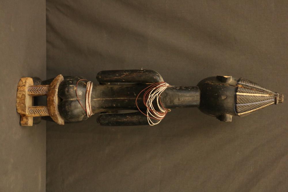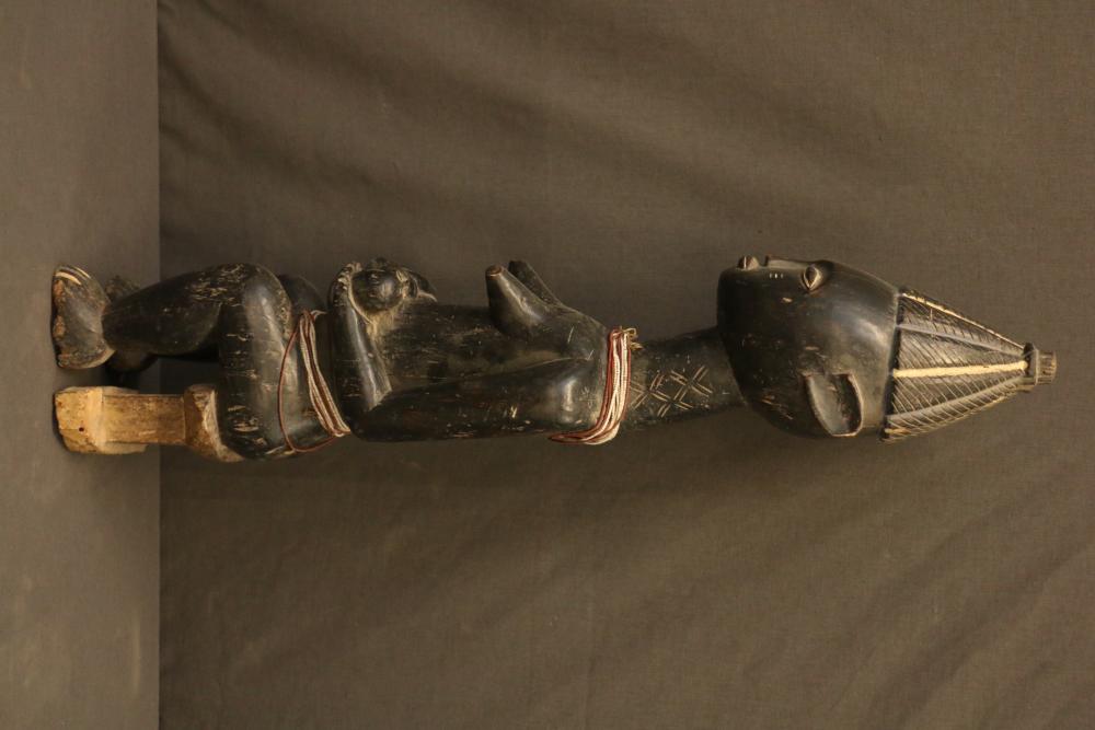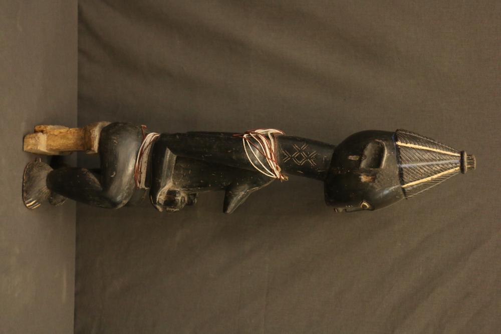 Over 170 lots of African art. Items include women's indigo wraps. Marka/Dafing people, Burkina Faso; Dan headdress, Liberia; large carved Mali-style African drum; old currency spears. Tuareg people, Mali & Niger; rod puppet head of Dankalankule, the Oryx antelope; Bandaka “jellyfish” form currency. Mambila & Chamba people; pendants, Coptic Christian people, Ethiopia; leg band. Mongo & Konda people, Congo; Koranko body mask, Guinea, Sierra Leone; abstract bogolan textile. Bamana people, Mali; ceremonial snake-form bayonet/knife. Lobi people, Burkina Faso; ceremonial blacksmith’s hammer, Northern Nigeria; wedding blanket. Tuareg people, Niger & Mali; West African heddle pulleys. (A) Senufo people, Ivory Coast; maternity figure. Lokko people, Sierra Leone; male Chi Wara head crest mask. Bamana people, Mali; rare Asafo flag bearer/dancer's skirt. Fante people, Ghana & more. Items are located in Pleasant Valley, NY.