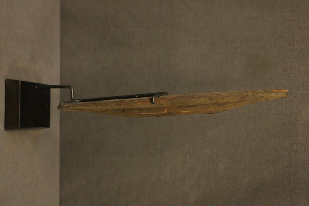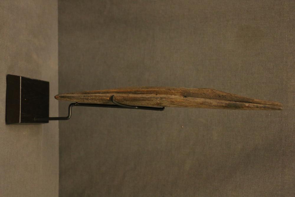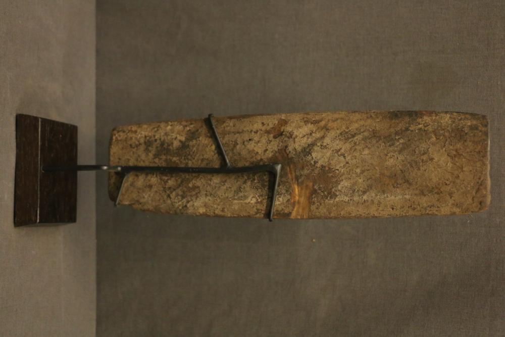 FORM FOR ANKLE LEG BAND MOLD. Mongo and Konda people, Congo. This wooden form was pressed into specially prepared clay or sand to create the mold for an ankle leg band. After the metal was set but still very hot, the ingot was wrapped around a log to create a cylinder. The leg band was then carefully burnished to create a smooth outer surface. The inside retains the uneven surface of the molten brass and impressions left by the log around which it was formed. (see LOT #8). Wood. H12in.