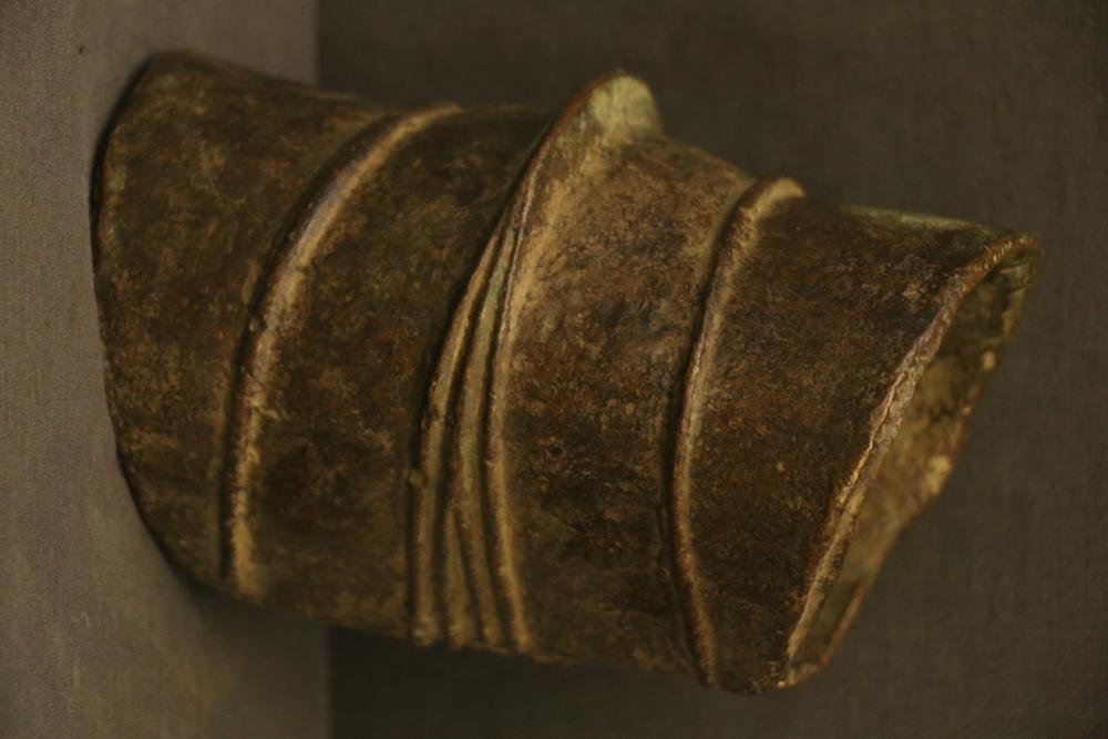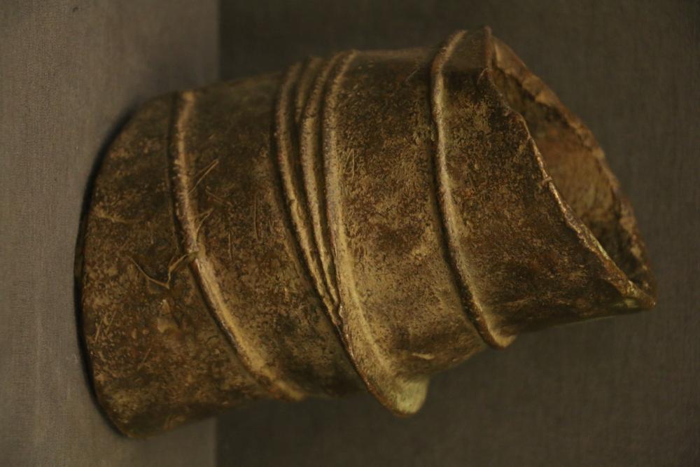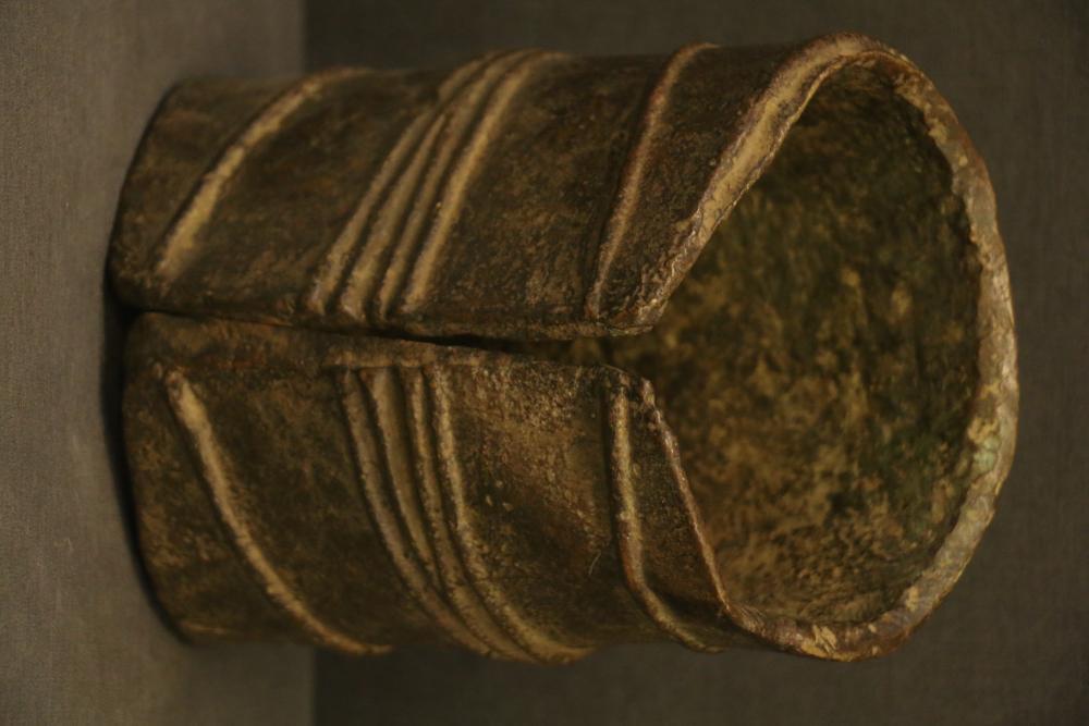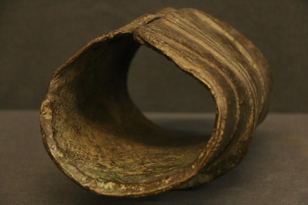 LEG BAND. Mongo and Konda people, Congo. This type of heavy brass leg band was worn by a wife of a wealthy man. It served as a store of wealth and would be removed if needed as a form of currency. Large rolls made from plant fiber wrapped in cloth were used to protect the wearer’s ankles (see picture). They were made by pouring molten brass into a mold in clay or sand (see LOT #9). Brass H8in Weight 8lb.