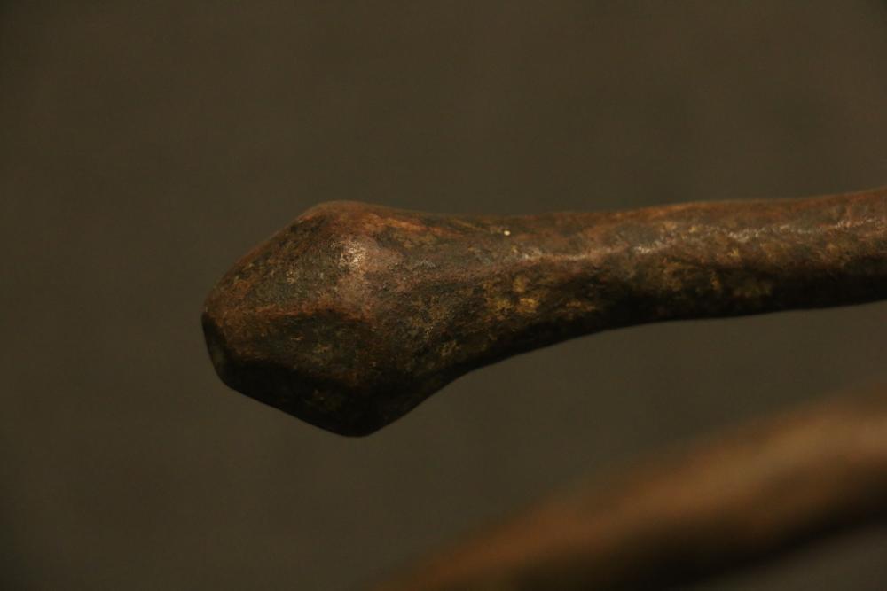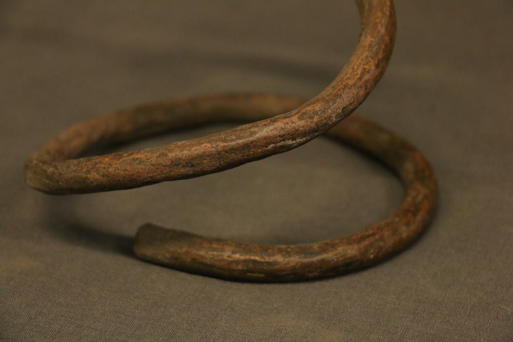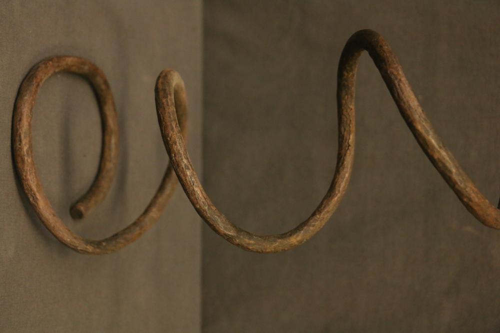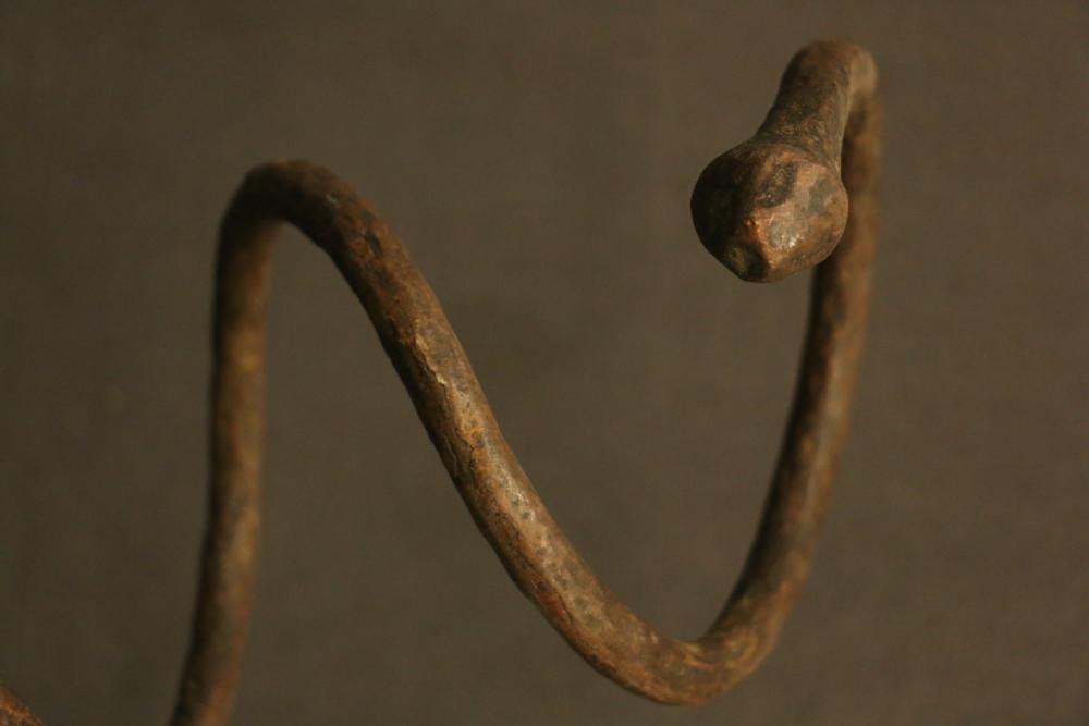SERPENTINE ROD CURRENCY. Iyembe people, Congo. Copper rods imported to Africa by Europeans as early as the 16th century were traded in many regions for goods such as palm oil, gold, and slaves. African blacksmiths cut the rods up, reshaped them, or melted them down. The molten copper was cast into a vast variety of objects, especially jewelry. In this case, the rod has been twisted into the shape of a snake, probably for some ceremonial purpose. A knob representing the head has been created at the upper end. The surface of the rod has many blacksmith’s hammer marks left when the heated rod was shaped into this spiral form. Copper. H 18in.