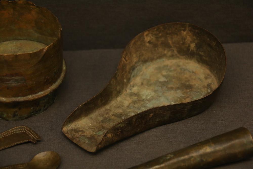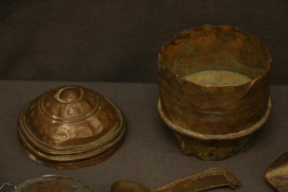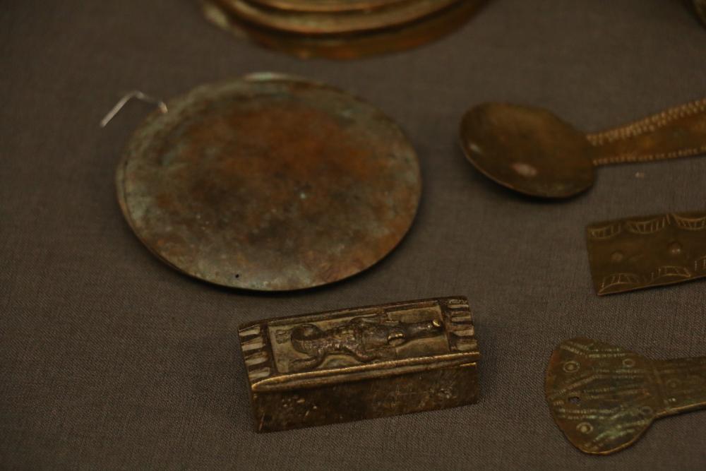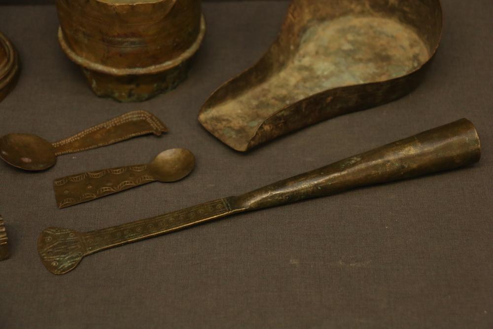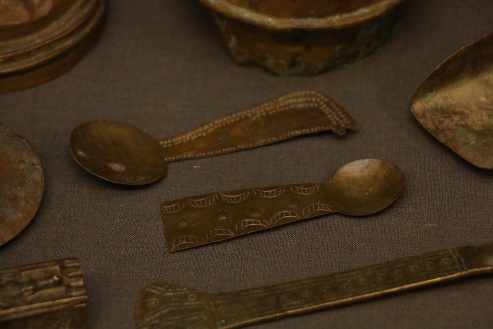 NINETEENTH CENTURY GOLD COAST EQUIPMENT TO STORE AND WEIGH GOLD. This material includes: (A) a portable, light weight hand held balance scale (nsania) consisting of two thin brass pans (this lot) suspended by strings from a balance beam (see picture showing such a scale hanging on the wall in a jeweler’s shop); (B) small brass box for storing gold dust (adaka ketwa) with crocodile gold weight lid; (C) large container for storing gold dust or gold weights with mammary-form top; (D) a long-handled spatula (saawa) with punched designs used to remove adulterating debris from gold dust; (E) a funnel-shaped scoop resembling a dust pan (famfa) used to examine large amounts of gold dust for impurities; (F) two small scoops used to transfer gold dust from the famfa to the scale. These scoops have punched designs and one has a fish tail handle.