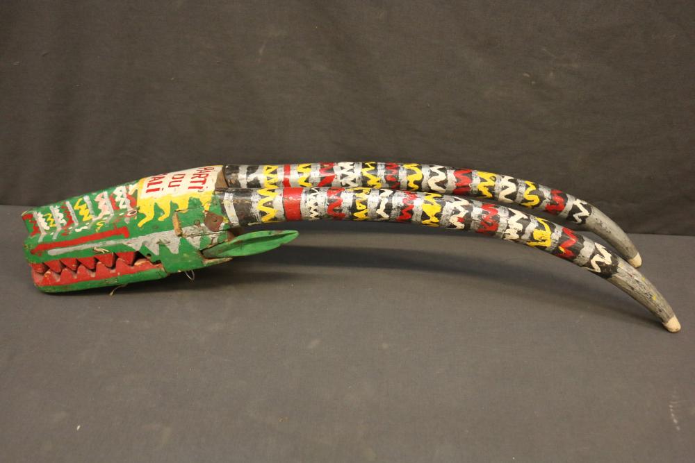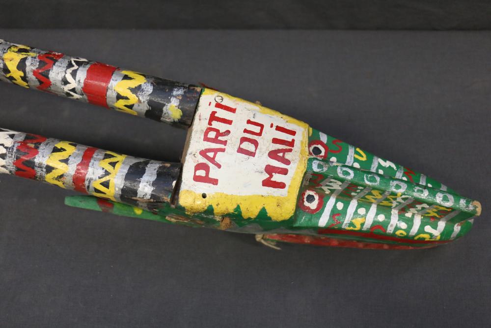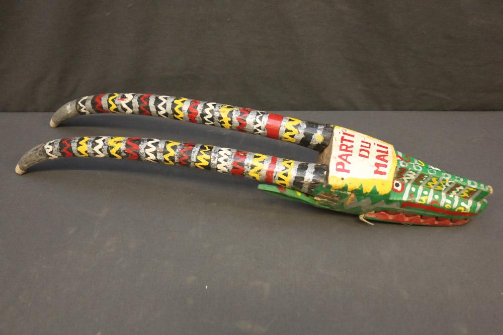 This animal rod puppet head has the horns and ears of an antelope and a sharply dentate mouth suggestive of a carnivore. The significance of "Parti du Mali" is unclear in this context. Literally translated as "Party of Mali", the phrase could refer to a political organization. In a phrase such as "prendre parti" the word "parti" can mean to choose or to be on the side of something, in this instance Mali. "Parti" could be a misspelling of or pun on the word "Patrie," meaning country or homeland. The articulated mouth is held in place by string. H 31.5 in. Wood, paint, string.Page number 135 figures 148 A, B in the book: The colorful Sogo Bò Puppets of Mali, Mary Sue Rosen Paul, Paul Peter Rosen.