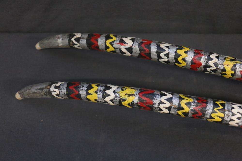 Over 170 lots of African art. Items include women's indigo wraps. Marka/Dafing people, Burkina Faso; Dan headdress, Liberia; large carved Mali-style African drum; old currency spears. Tuareg people, Mali & Niger; rod puppet head of Dankalankule, the Oryx antelope; Bandaka “jellyfish” form currency. Mambila & Chamba people; pendants, Coptic Christian people, Ethiopia; leg band. Mongo & Konda people, Congo; Koranko body mask, Guinea, Sierra Leone; abstract bogolan textile. Bamana people, Mali; ceremonial snake-form bayonet/knife. Lobi people, Burkina Faso; ceremonial blacksmith’s hammer, Northern Nigeria; wedding blanket. Tuareg people, Niger & Mali; West African heddle pulleys. (A) Senufo people, Ivory Coast; maternity figure. Lokko people, Sierra Leone; male Chi Wara head crest mask. Bamana people, Mali; rare Asafo flag bearer/dancer's skirt. Fante people, Ghana & more. Items are located in Pleasant Valley, NY.