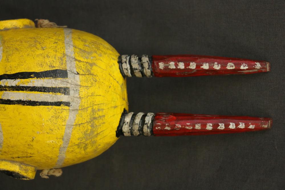 This mask of Jine, a bush spirit, has human facial features and the horns of a goat or an antelope. H 19 in. Wood, paint, fiber. Page number 147 figure 171 in the book: The colorful Sogo Bò Puppets of Mali, Mary Sue Rosen Paul, Paul Peter Rosen.