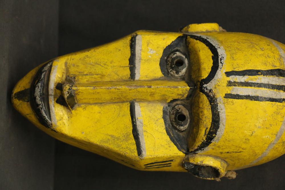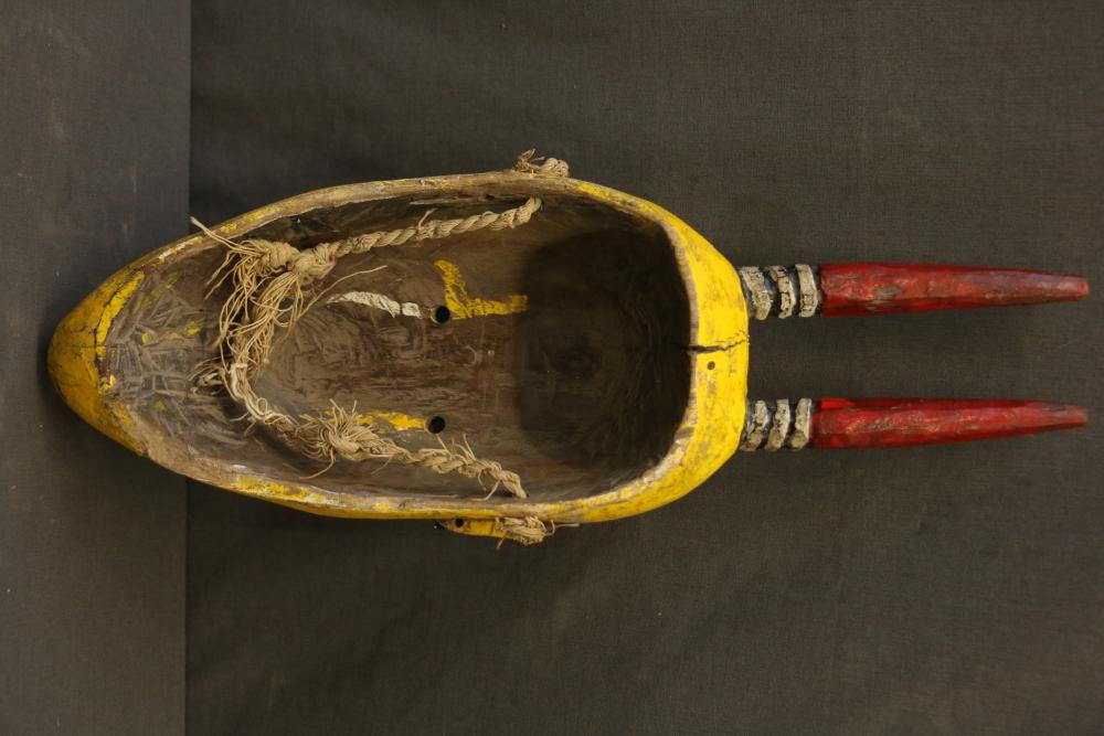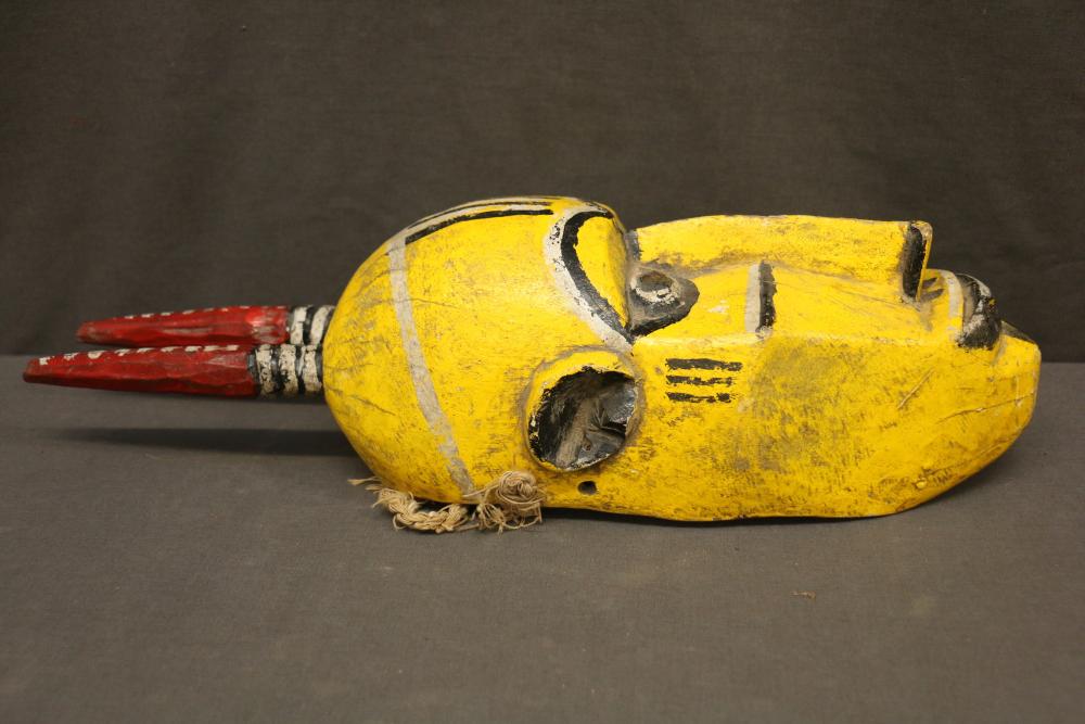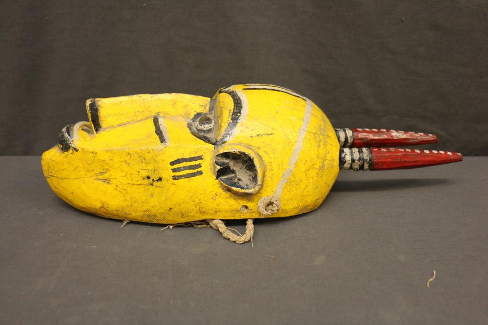 Over 170 lots of African art. Items include women's indigo wraps. Marka/Dafing people, Burkina Faso; Dan headdress, Liberia; large carved Mali-style African drum; old currency spears. Tuareg people, Mali & Niger; rod puppet head of Dankalankule, the Oryx antelope; Bandaka “jellyfish” form currency. Mambila & Chamba people; pendants, Coptic Christian people, Ethiopia; leg band. Mongo & Konda people, Congo; Koranko body mask, Guinea, Sierra Leone; abstract bogolan textile. Bamana people, Mali; ceremonial snake-form bayonet/knife. Lobi people, Burkina Faso; ceremonial blacksmith’s hammer, Northern Nigeria; wedding blanket. Tuareg people, Niger & Mali; West African heddle pulleys. (A) Senufo people, Ivory Coast; maternity figure. Lokko people, Sierra Leone; male Chi Wara head crest mask. Bamana people, Mali; rare Asafo flag bearer/dancer's skirt. Fante people, Ghana & more. Items are located in Pleasant Valley, NY.