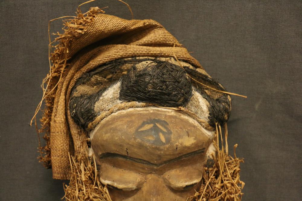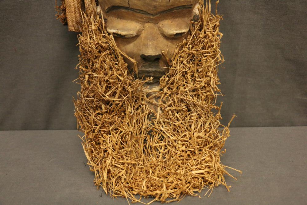 Over 170 lots of African art. Items include women's indigo wraps. Marka/Dafing people, Burkina Faso; Dan headdress, Liberia; large carved Mali-style African drum; old currency spears. Tuareg people, Mali & Niger; rod puppet head of Dankalankule, the Oryx antelope; Bandaka “jellyfish” form currency. Mambila & Chamba people; pendants, Coptic Christian people, Ethiopia; leg band. Mongo & Konda people, Congo; Koranko body mask, Guinea, Sierra Leone; abstract bogolan textile. Bamana people, Mali; ceremonial snake-form bayonet/knife. Lobi people, Burkina Faso; ceremonial blacksmith’s hammer, Northern Nigeria; wedding blanket. Tuareg people, Niger & Mali; West African heddle pulleys. (A) Senufo people, Ivory Coast; maternity figure. Lokko people, Sierra Leone; male Chi Wara head crest mask. Bamana people, Mali; rare Asafo flag bearer/dancer's skirt. Fante people, Ghana & more. Items are located in Pleasant Valley, NY.
