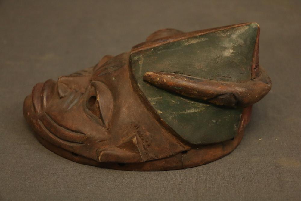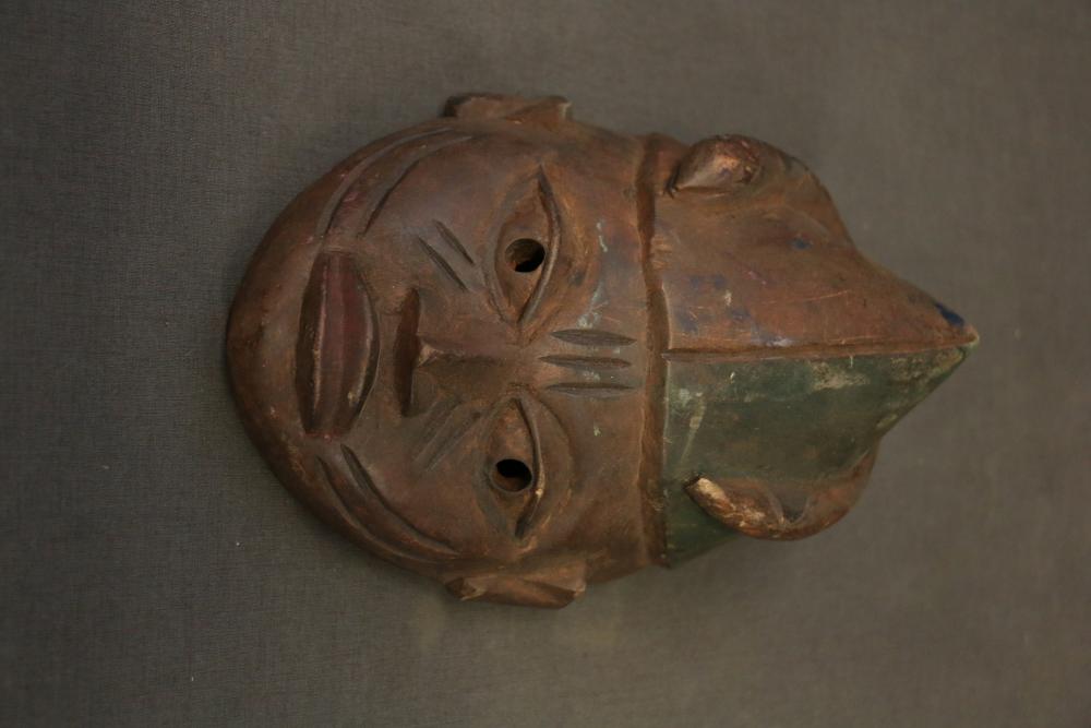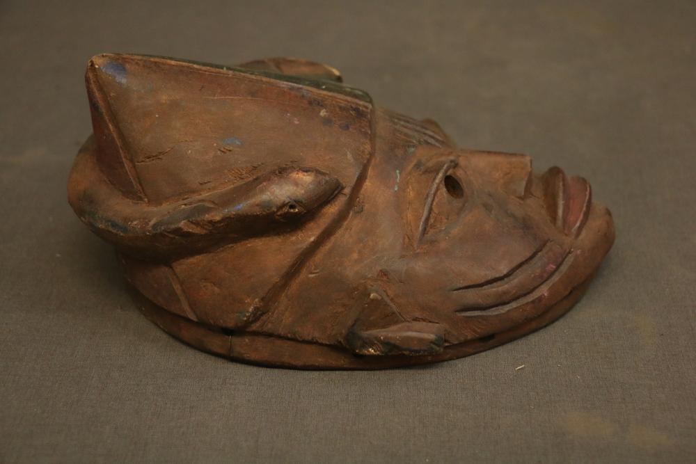Over 170 lots of African art. Items include women's indigo wraps. Marka/Dafing people, Burkina Faso; Dan headdress, Liberia; large carved Mali-style African drum; old currency spears. Tuareg people, Mali & Niger; rod puppet head of Dankalankule, the Oryx antelope; Bandaka “jellyfish” form currency. Mambila & Chamba people; pendants, Coptic Christian people, Ethiopia; leg band. Mongo & Konda people, Congo; Koranko body mask, Guinea, Sierra Leone; abstract bogolan textile. Bamana people, Mali; ceremonial snake-form bayonet/knife. Lobi people, Burkina Faso; ceremonial blacksmith’s hammer, Northern Nigeria; wedding blanket. Tuareg people, Niger & Mali; West African heddle pulleys. (A) Senufo people, Ivory Coast; maternity figure. Lokko people, Sierra Leone; male Chi Wara head crest mask. Bamana people, Mali; rare Asafo flag bearer/dancer's skirt. Fante people, Ghana & more. Items are located in Pleasant Valley, NY.