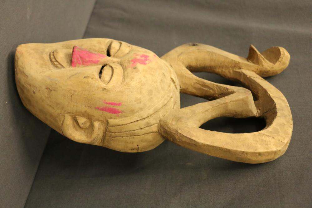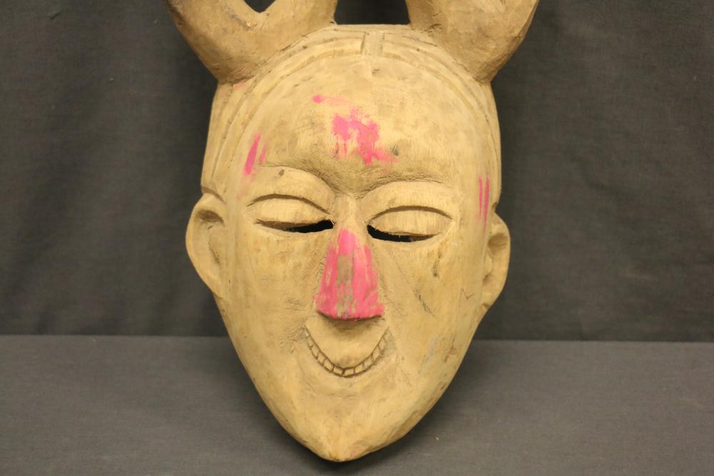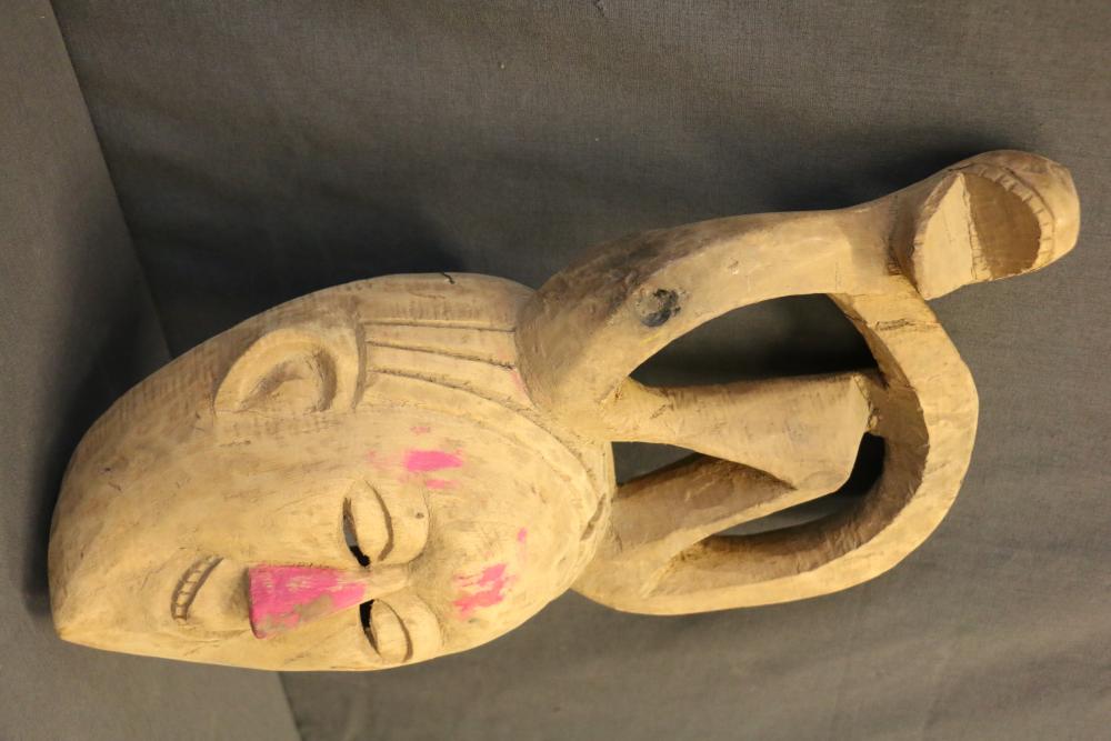Over 170 lots of African art. Items include women's indigo wraps. Marka/Dafing people, Burkina Faso; Dan headdress, Liberia; large carved Mali-style African drum; old currency spears. Tuareg people, Mali & Niger; rod puppet head of Dankalankule, the Oryx antelope; Bandaka “jellyfish” form currency. Mambila & Chamba people; pendants, Coptic Christian people, Ethiopia; leg band. Mongo & Konda people, Congo; Koranko body mask, Guinea, Sierra Leone; abstract bogolan textile. Bamana people, Mali; ceremonial snake-form bayonet/knife. Lobi people, Burkina Faso; ceremonial blacksmith’s hammer, Northern Nigeria; wedding blanket. Tuareg people, Niger & Mali; West African heddle pulleys. (A) Senufo people, Ivory Coast; maternity figure. Lokko people, Sierra Leone; male Chi Wara head crest mask. Bamana people, Mali; rare Asafo flag bearer/dancer's skirt. Fante people, Ghana & more. Items are located in Pleasant Valley, NY.