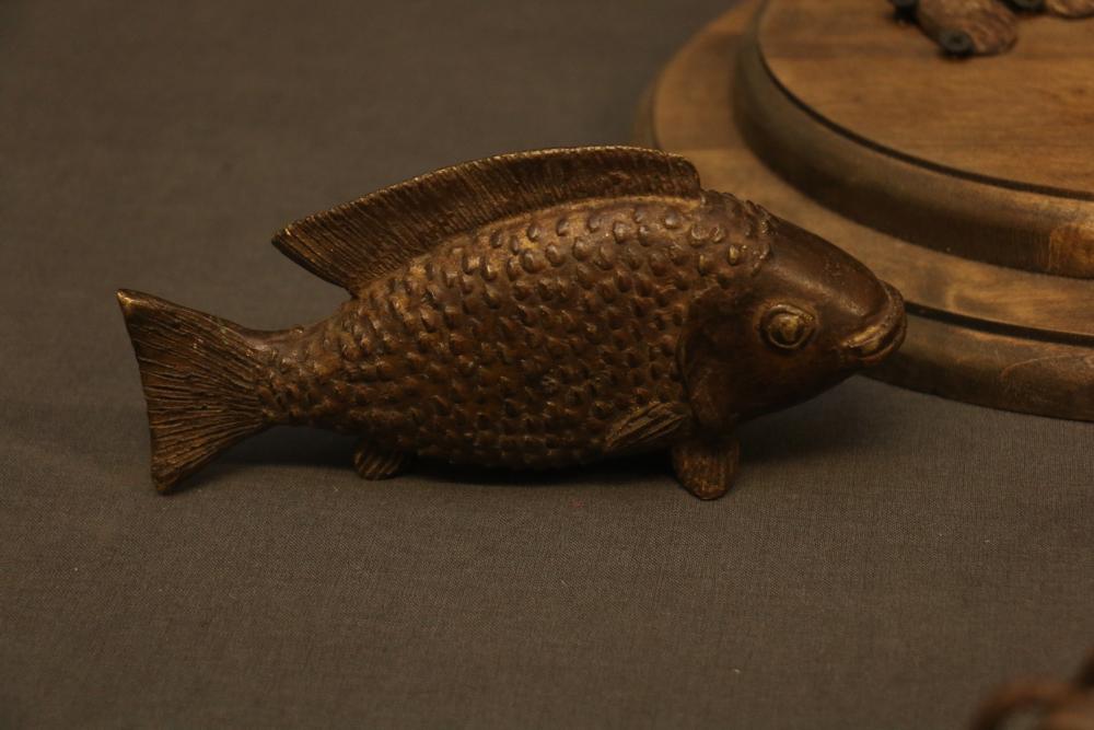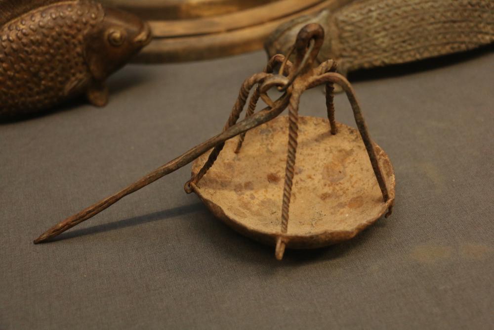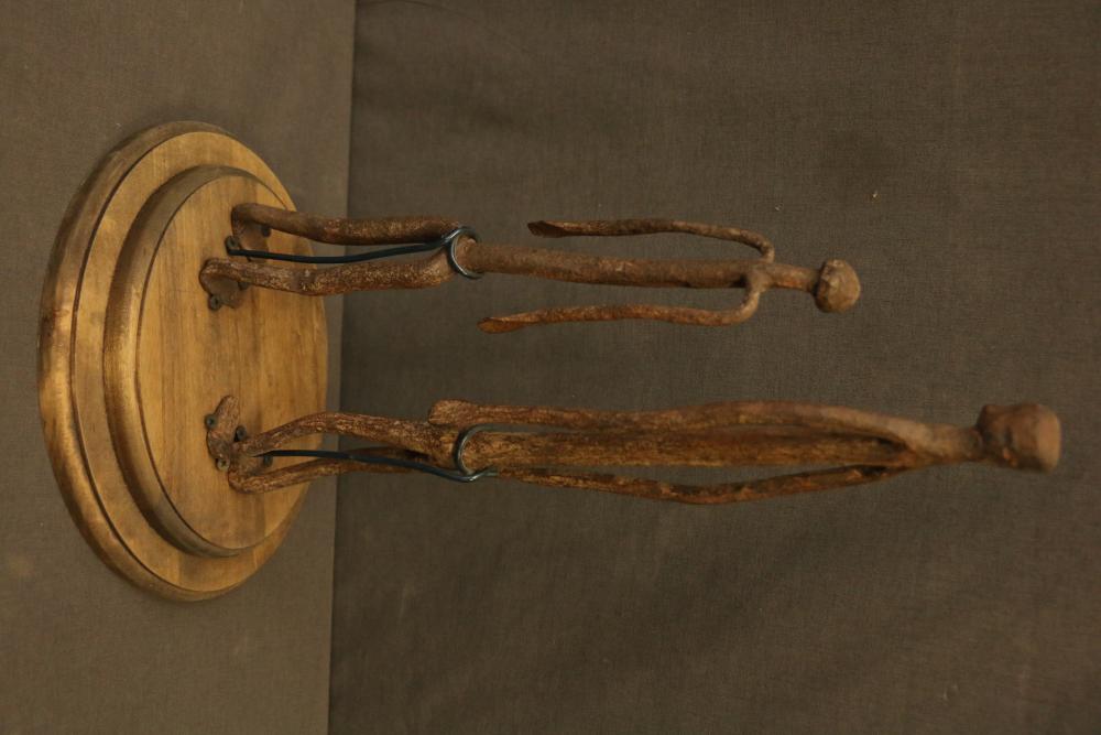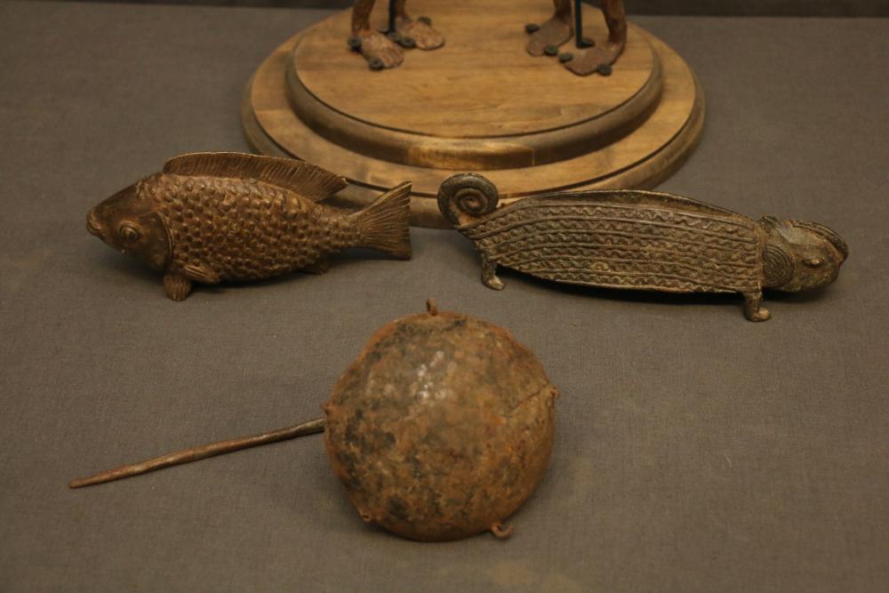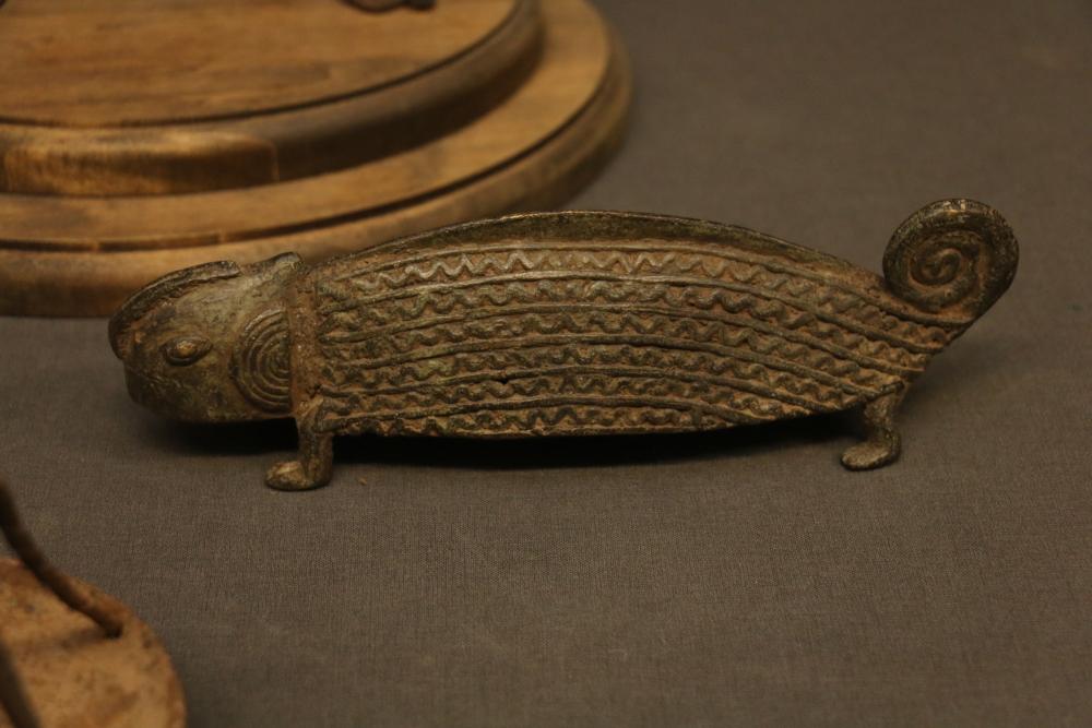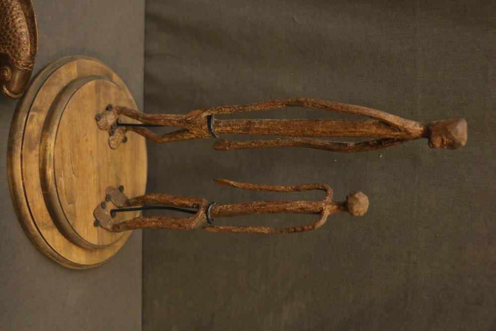 Pair Of Iron Dogon Figures, “Very old,” Mali. Provenance - Exhibition: “Materials Transformed The Art of African Sculpture From the Mary Sue and Paul Peter Rosen Collection.” Free Library Gallery, Philadelphia, PA 2012, Iron oil lantern dogon mali, Solid Cast Brass, The Nile Perch or Capitane, Ivory Coast, & Brass Chameleon, “Unusual.” handcast with traditional decoration depicting water, Mali. Largest being 18.5" tall.