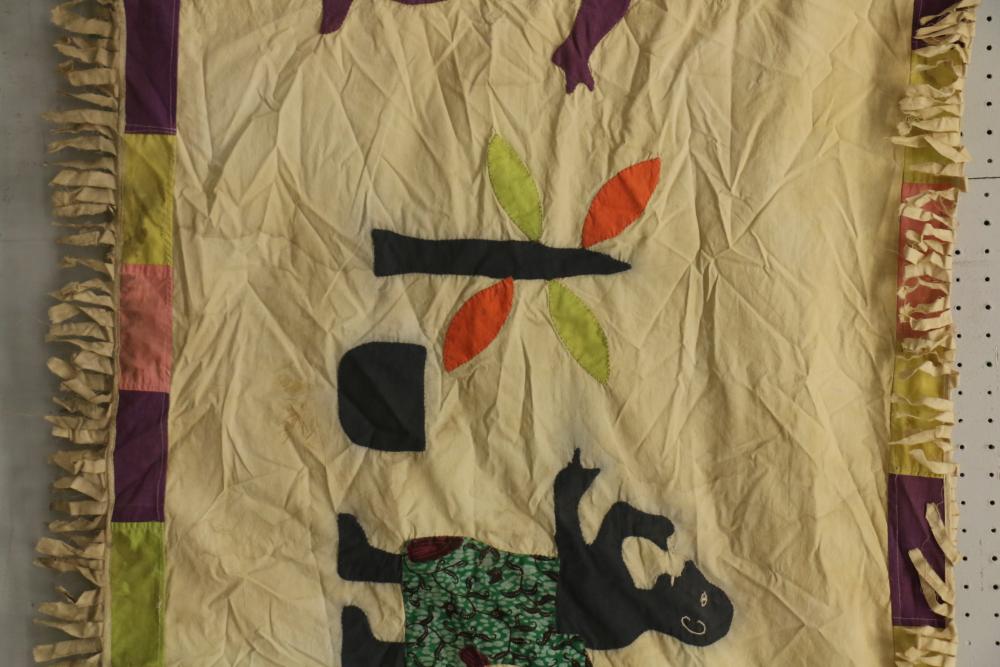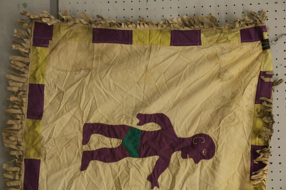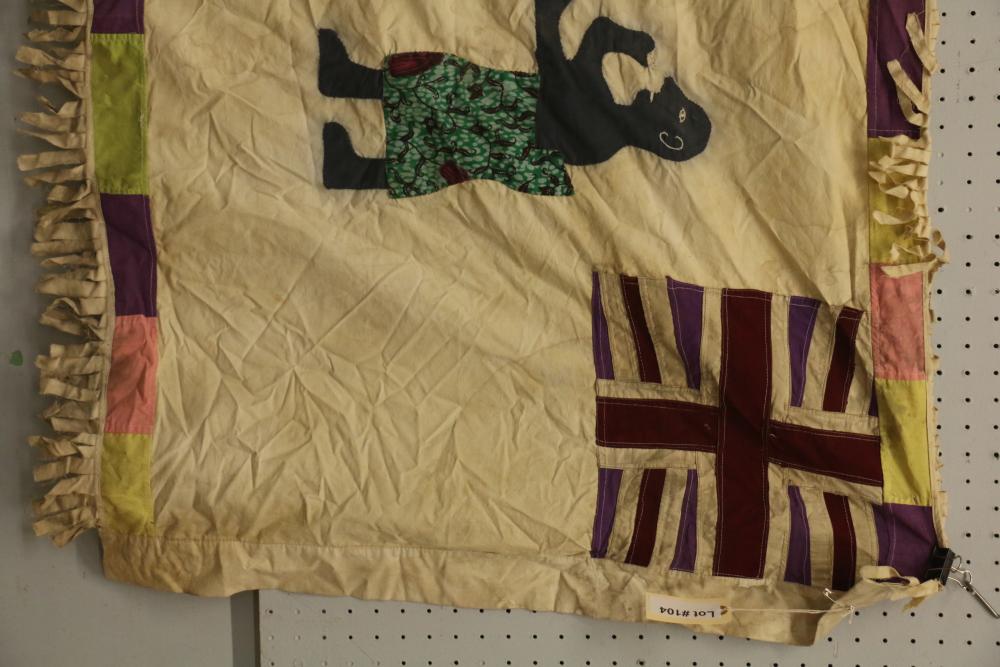 Asafo Militia flag depicting a Chief in a patterned robe pointing to an odum tree which is the source of his spiritual powers and authority. A member of the Asafo Company is looking on. Message: All members of the Company are protected by the Chief. Proverb: A Chief is like an odum tree; he has no front or back (he is responsible for everyone). The canton is an unusual modification of the Union Jack. The figures are hand sewn with embroidered details. Cotton textile. 59.5in. X 30.5in.