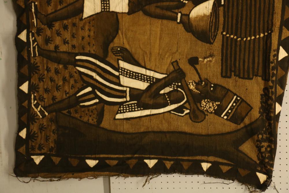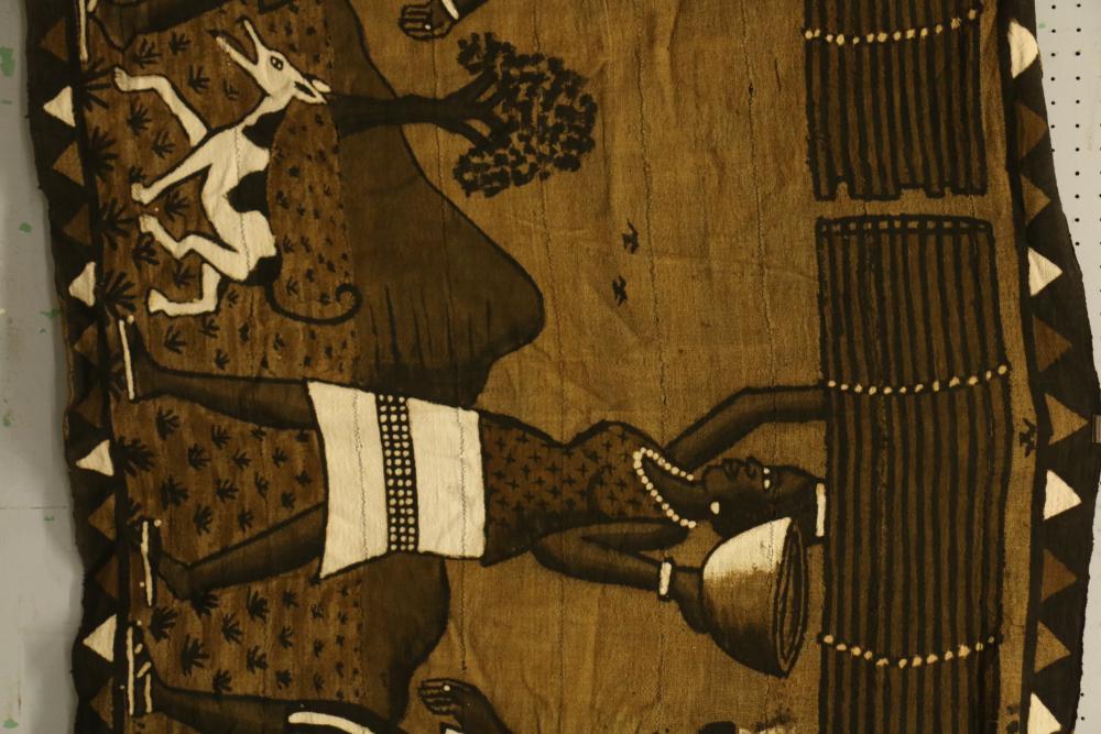 Pictorial bogolan (“Mudcloth”) textile depicting two women with head loads of fire wood followed by a farmer with a hoe on one shoulder. 10 strips of hand woven country cloth machine sewn. 71in. x 46in. Bamana people, Segou, Mali. See “Bogolanfini Mud Cloth” by S. Hilu and I. Hersey.