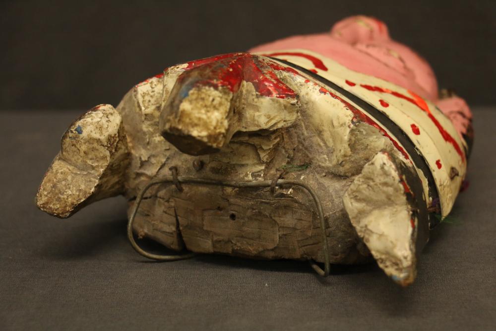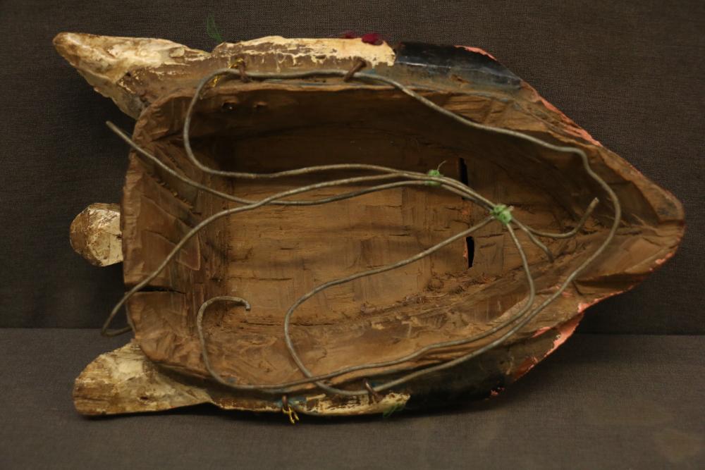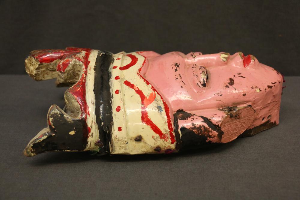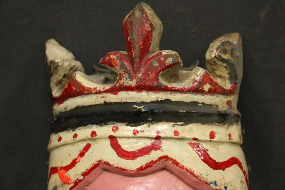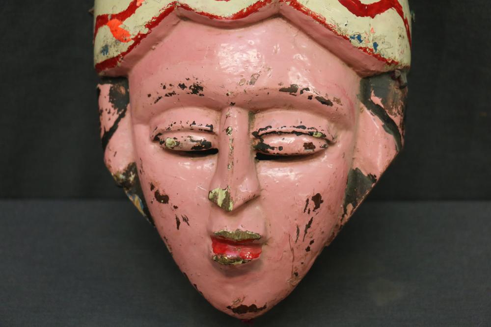 FACE MASK. Temne people, Sierra Leone. This mask was worn at a Jolly Society celebration. It is part of an elaborate “fancy” costume that was attached to the mask with nails and was supported by a wire armature that is now folded inside the mask. The mask depicts a royal person but the intended message can only be known from songs and music at the performance. H 11in. Wood, paint, nails, wire. See Rosen, Rosen 2013