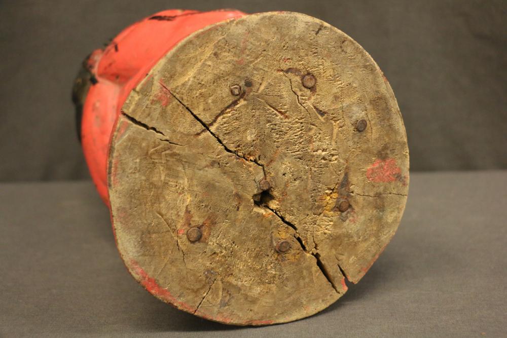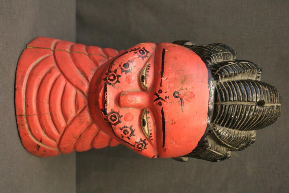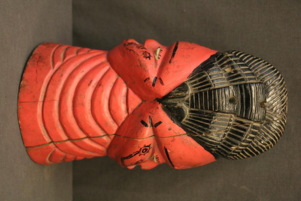 JANUS HEAD CREST MASK. Temne people, Sierra Leone. This mask with the same face in the front and back and symmetrical coiffure was nailed to an armature that rested on the wearers head and shoulders. Nails used to attach it to the armature remain on the under surface where a hole in the center contained a rolled piece of paper inscribed with ritual text. Bust masks such as this were worn by men shrouded in fancy costumes during Jolly Society masquerades. The facial markings represent traditional tattoos. Feathers were put in the holes in the coiffure. H 13in. Wood, paint, mails. See Rosen, Rosen 2013 p64-65.