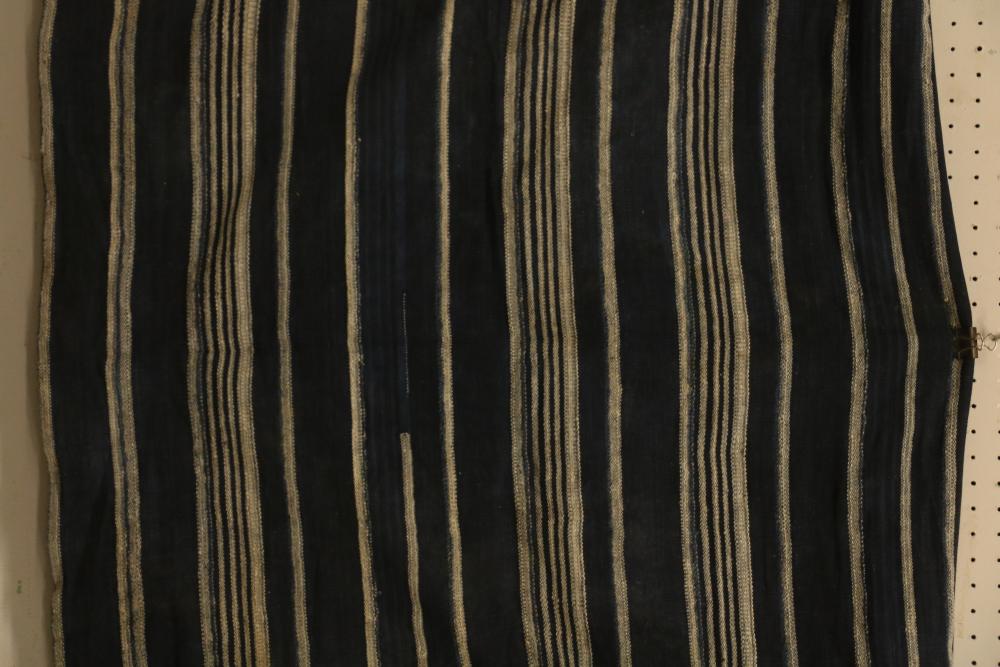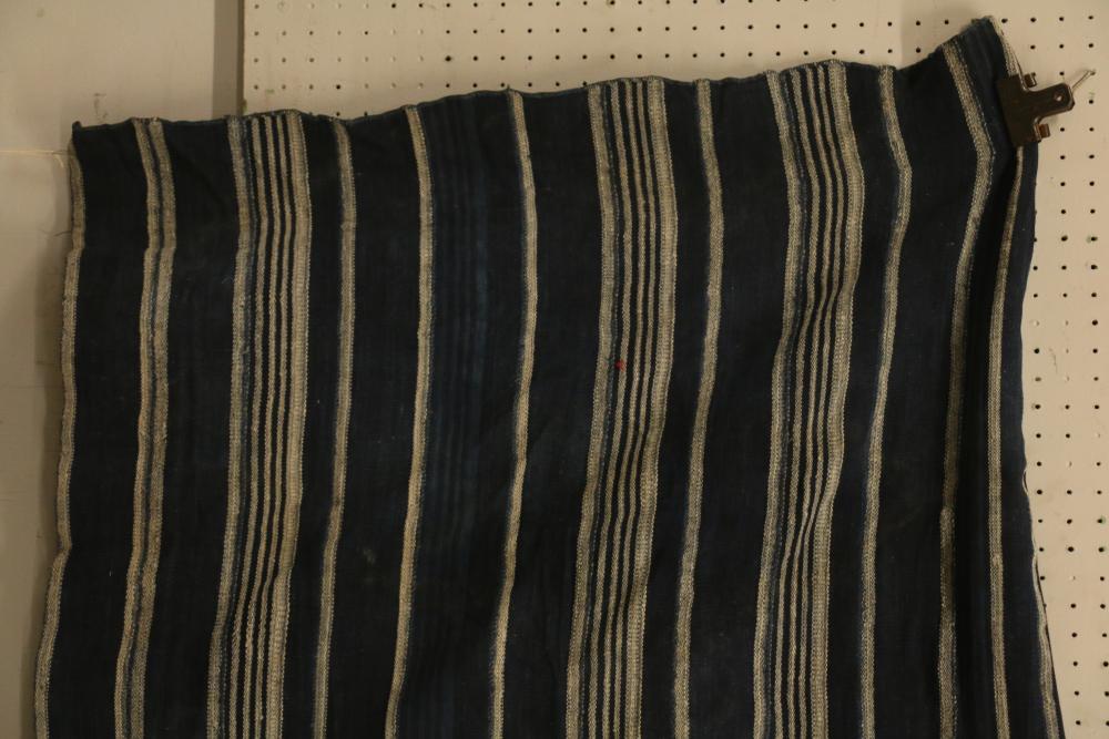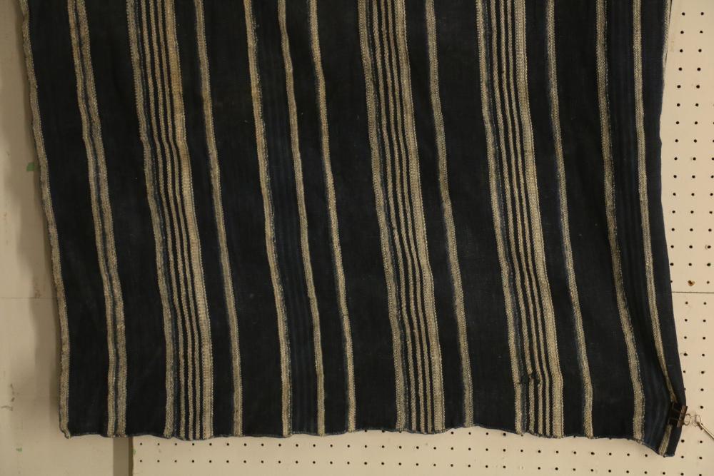 WOMAN’S INDIGO WRAP. Mossi people, Burkina Faso. This cloth consists of 12 hand woven, hand sewn strips with three different warp patterns. The ends have been hemmed by hand. L 67in. W 39in. Cotton.