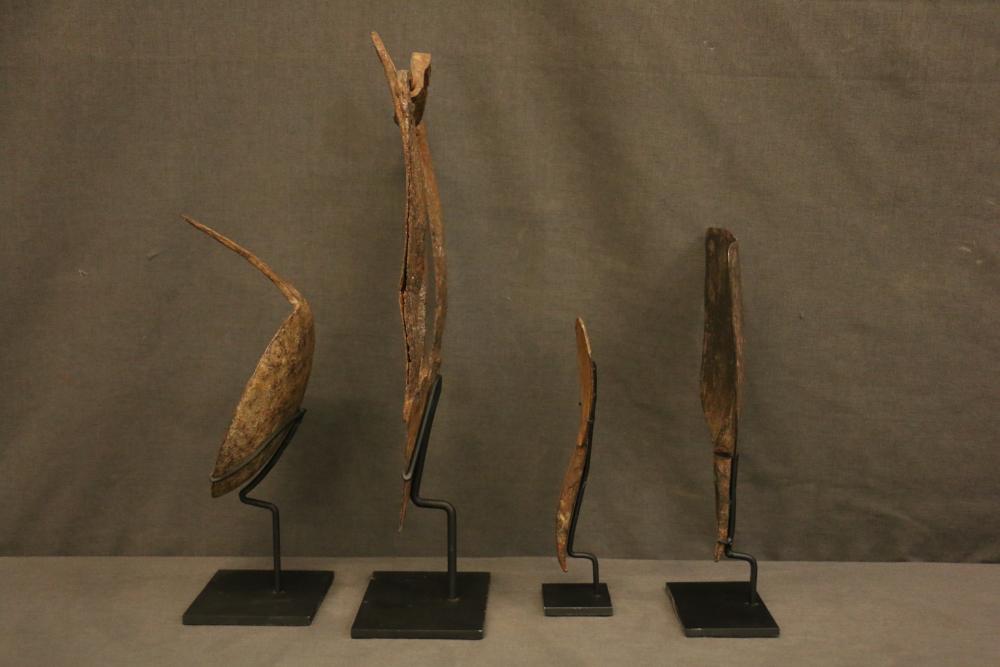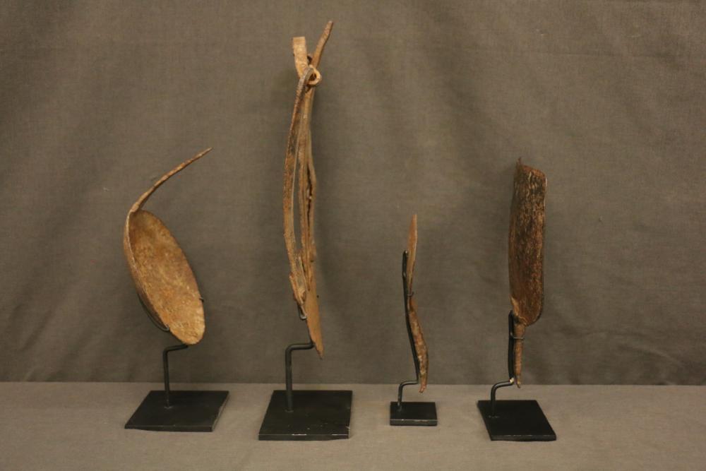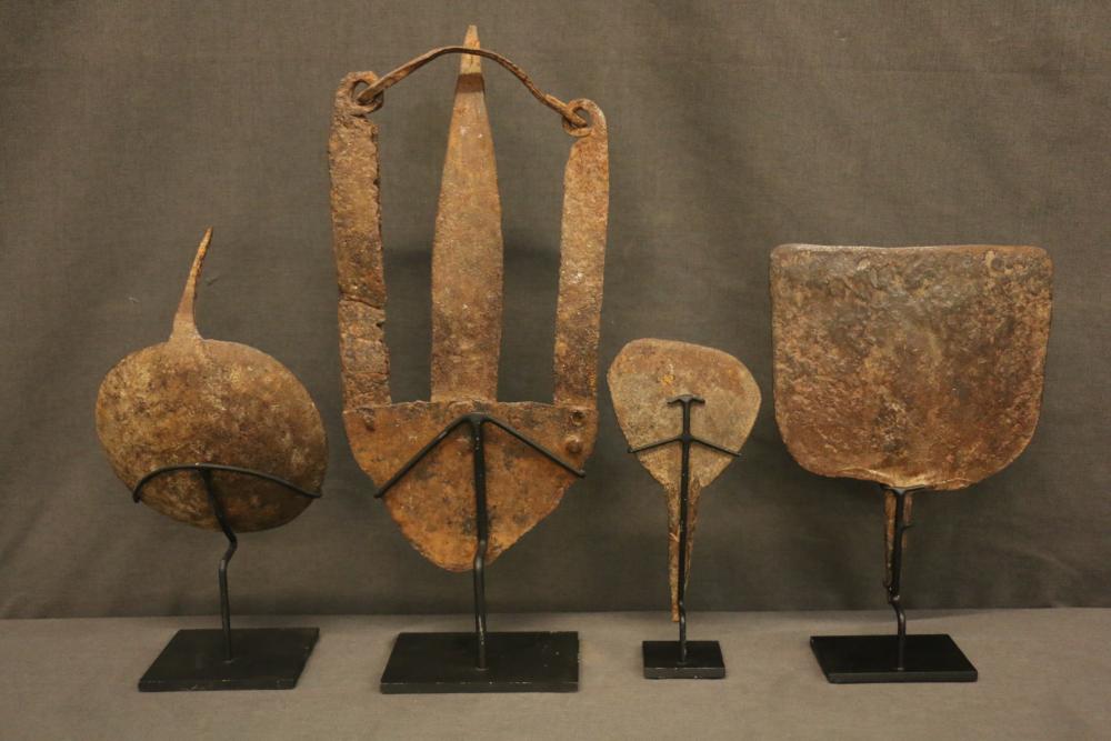 FOUR NIGERIAN HOE BLADES. Hoes were vitally important utilitarian tools in African agrarian societies since survival literally depended on the food farmers grew and could sell. Hoe blades were forged by local blacksmiths in forms that were traditional for a particular tribe and best adapted to local soil conditions. Most hoe blades were attached to short handles that were carved by blacksmiths. (See Lot #17). Hoes were also valued as a form of currency in important transactions like bride wealth. The four offered in this lot show the diverse artistic qualities of Nigerian hoe blades. Each on a custom base. (A) Hausa people, northern Nigeria. This unusual blade is adapted to the sandy soil on the border of the Sahara desert. It was attached to a wooden handle (see picture). Hand forged iron. H 14in. (B) Gombe people. The sharp spine of this cup-shaped blade was inserted into a wooden handle (see picture). In addition to being a useful tool known locally as kwadempe, it was exchanged as bride wealth in marriage contracts. Said to date from early 1900s. Ex Roberto Ballarini collection, Milan Italy. Hand forged iron. H 5.5in. (C) The blade has a serpentine form when seen from the side. Shows considerable wear from use. Old hand forged iron. H 7in. (D) Shovel form. Hand forged iron. H 9in.