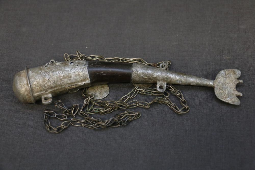 RARE FISH-FORM BUNDU AMULET. Mende people, Sierra Leone. Amulets like this were worn by young women after initiation into the women’s Bundu Society (see photograph). Made from hollowed out goat horn with silver fish tail and cap, three coin-shaped silver medallions, and a silver chain. The fish-form is a very rare, unusual version. These amulets were said to contain “medicine” capable of resisting witches. Horn, silver. Amulet 7in.