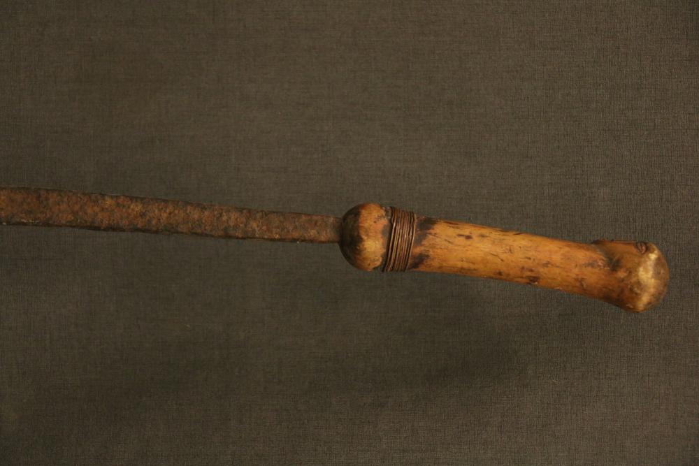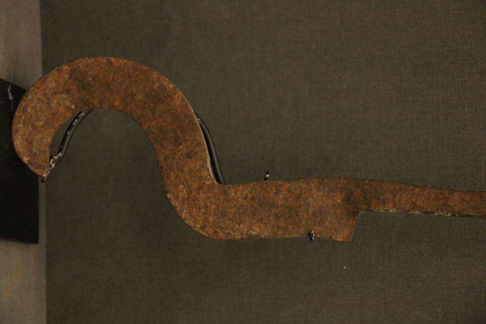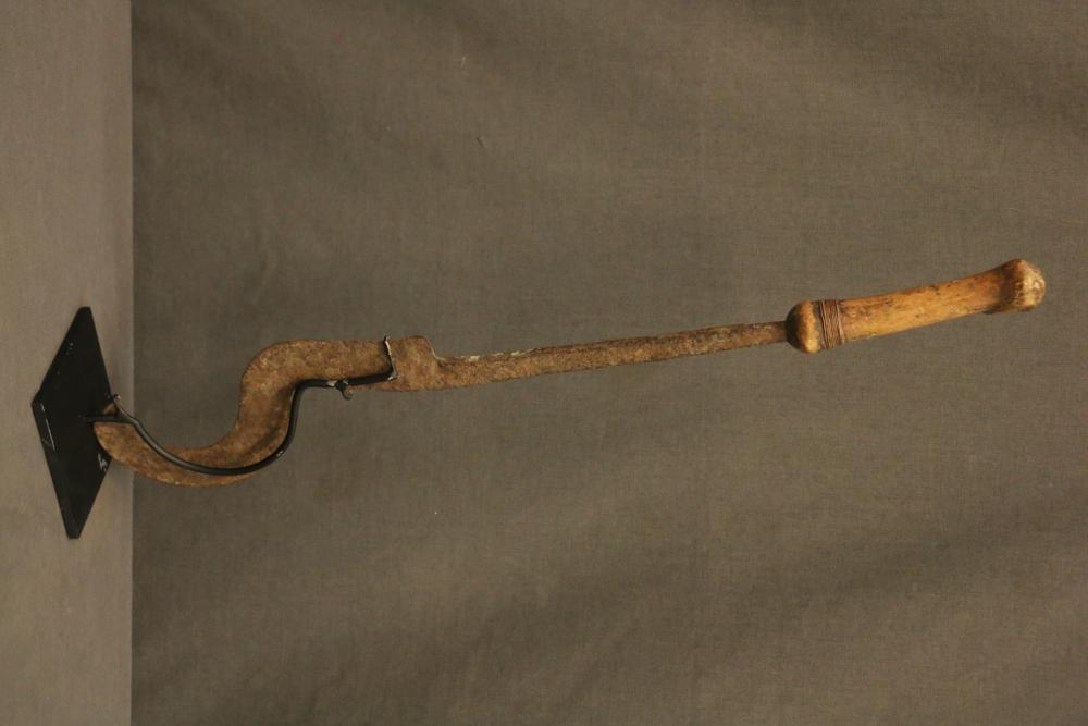 WOMAN’S LONG-HANDLED SICKLE-FORM KNIFE WITH HOOKED BLADE. Tutsi and Hutu people, eastern Congo, Uganda, Rwanda. Can be used as a weapon, but mostly used to knock down fruit from trees. Well-worn wood handle wrapped in copper wire. On custom base. Hand forged iron, wood, copper. H 22.5in.