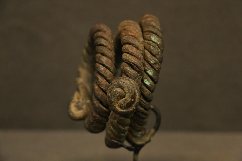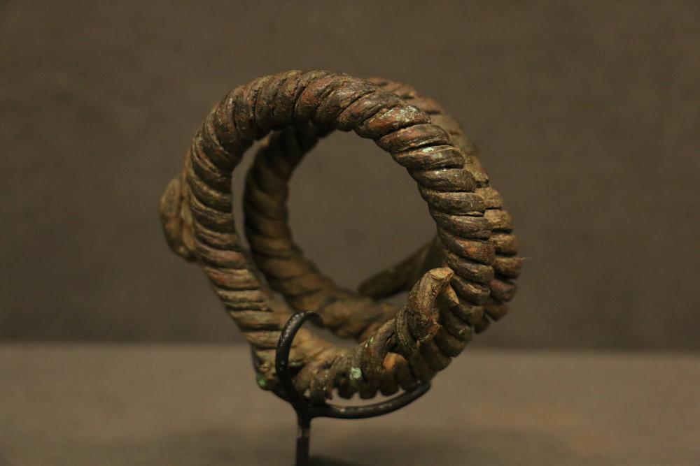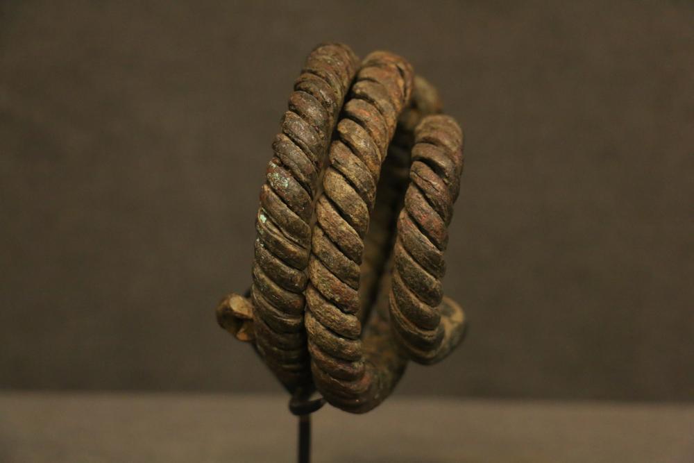 TWISTED TRIPLE COIL KNOTTED CURRENCY BRACELET. Igbo people, Nigeria. Bracelets made from twisted metal rods were masterpieces created by Nigerian blacksmiths in the late 19th century. Heavy rings such as this piece were reserved for important trades and kept as a store of wealth. The end of the twisted rod is defined by a hairpin turn where the rod doubles back on itself. The knot is a symbol of permanence. The skill required to create this bracelet free hand from a hot copper rod may no longer exist. On custom base. Oxidized copper. H2in. Diameter 4in. Exhibited at the Pen and Brush Gallery New York 2003.