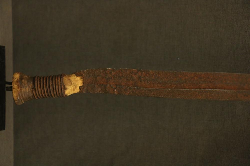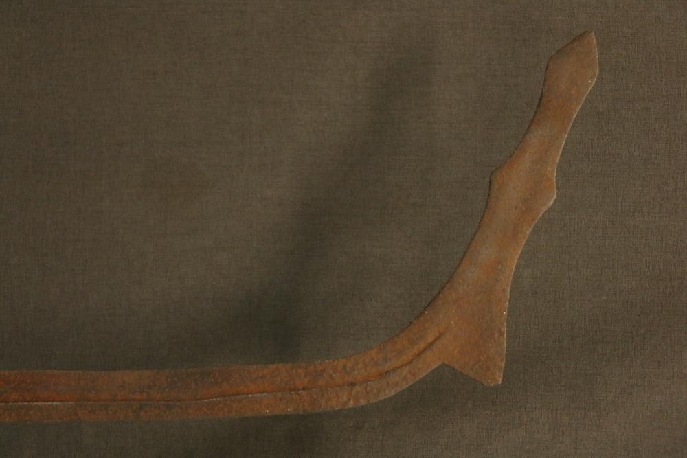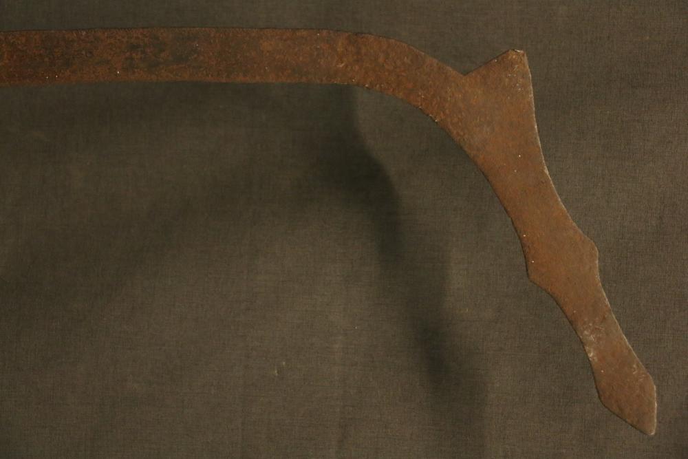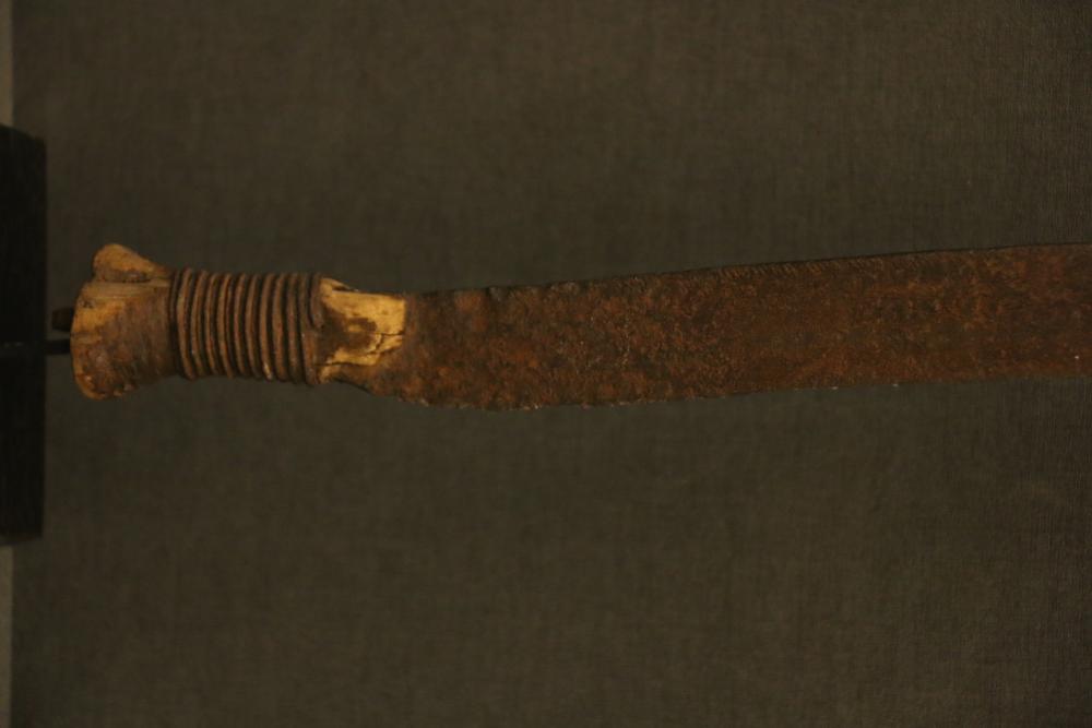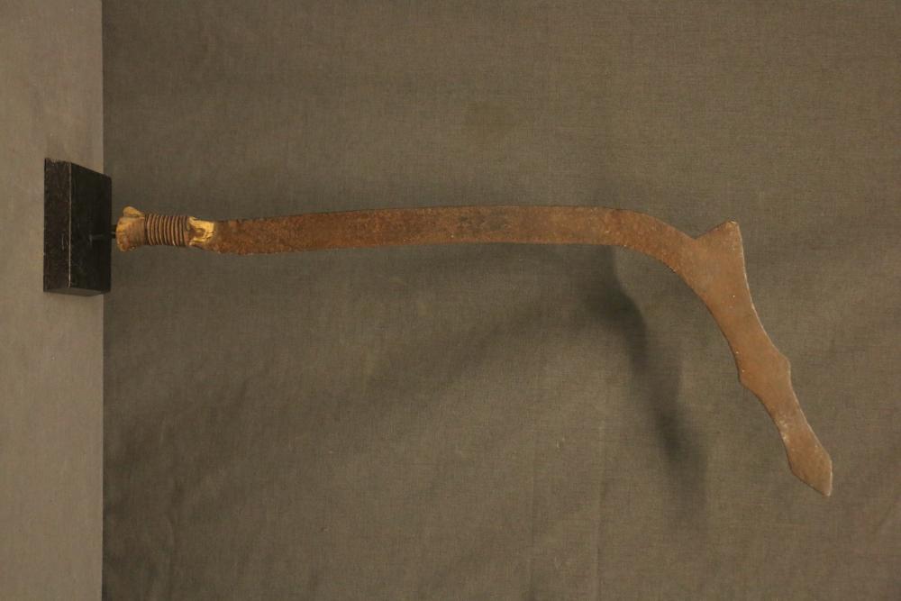LONG SICKLE=SHAPED WEAPON. Ngombe people, Congo. The blade is sharp on the concave edge of the straight shaft. The curved tip is sharp on both edges. This hand forged blade is set in a wood handle that is wrapped with iron wire. A loop at the end of the handle protrudes through the bottom of the handle. Black smith’s hammer marks apparent. Indistinct chevron design on shaft of blade. Dated to 1930s. On custom base. Iron, wood. H23in.