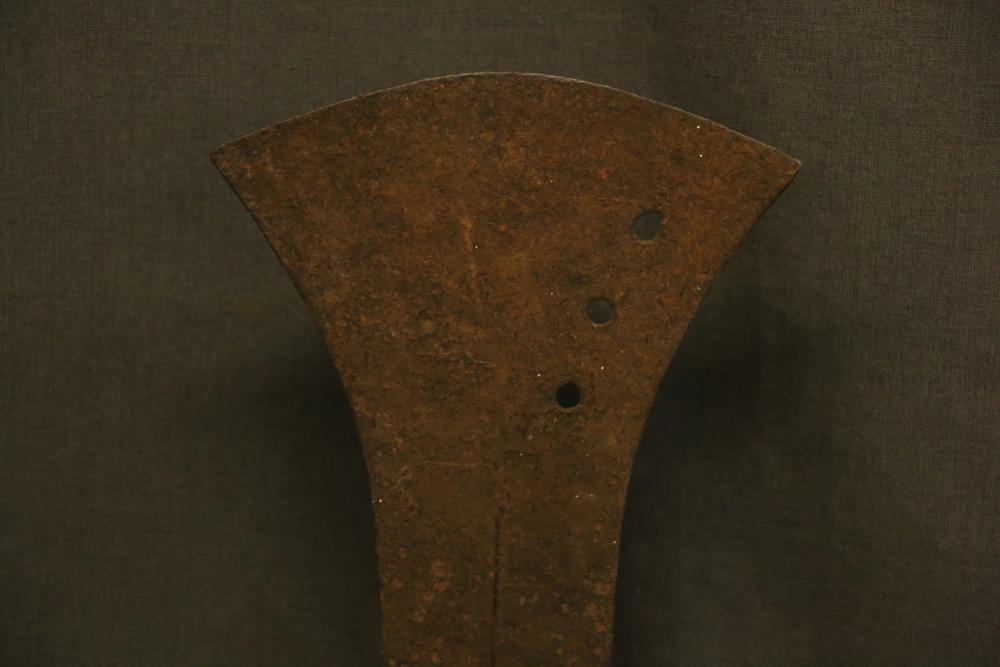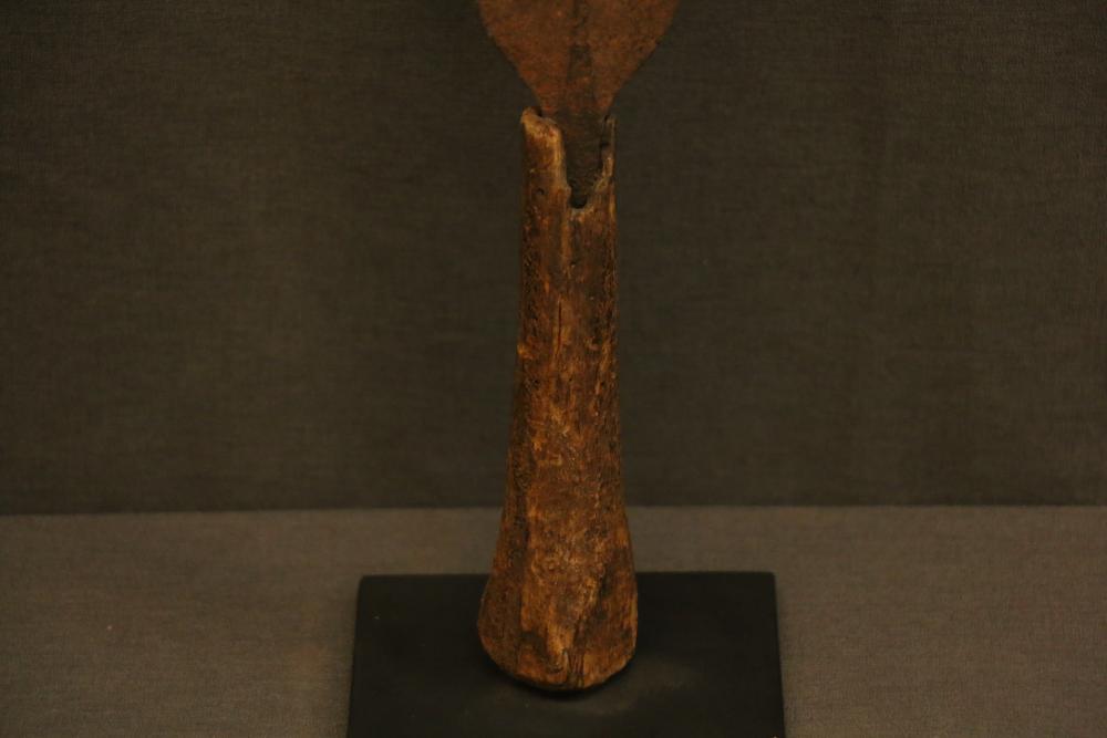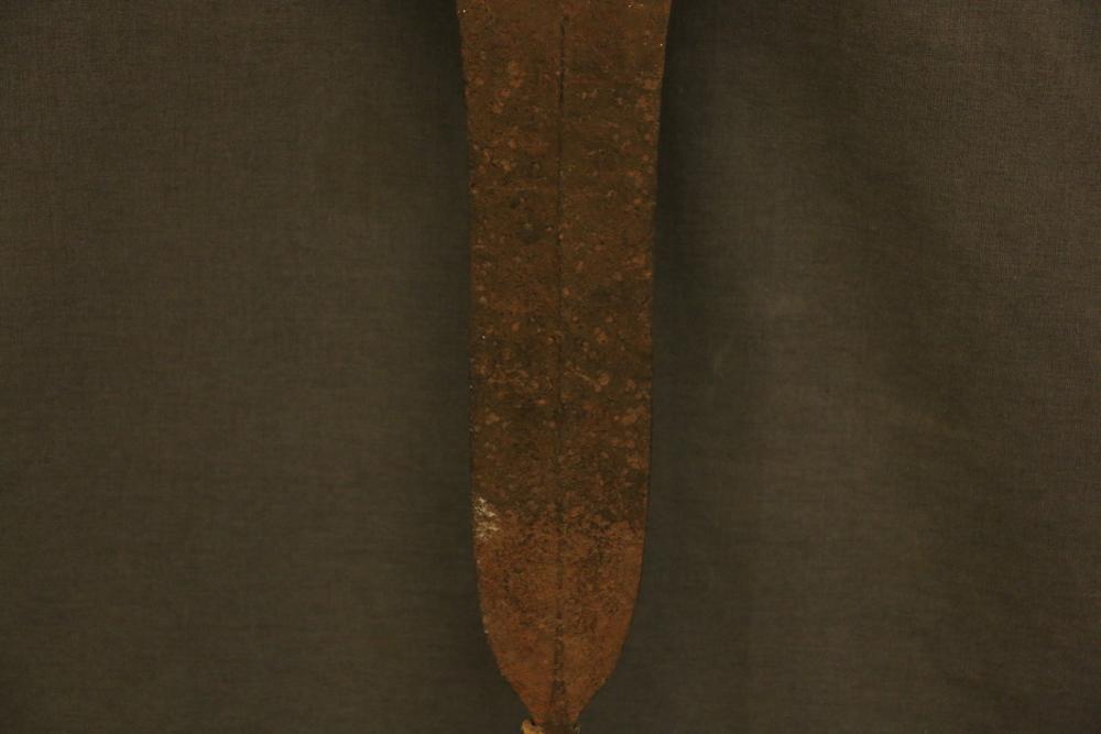 SLASHING KNIFE. Konda or Mongo people, Congo. Typical tulip shape with flared rounded end. Central rib gives rise to subtle branches near the top. Decorative material was sometimes hung from or attached to the holes. Edges sharp. Used as a weapon but also carried as a mark of prestige in certain ceremonies. Dated to late 19th or early 20th century. Hand forged iron with blacksmith’s marks. Wooden handle shows wear from use. On custom base. Iron, wood. H 21in.