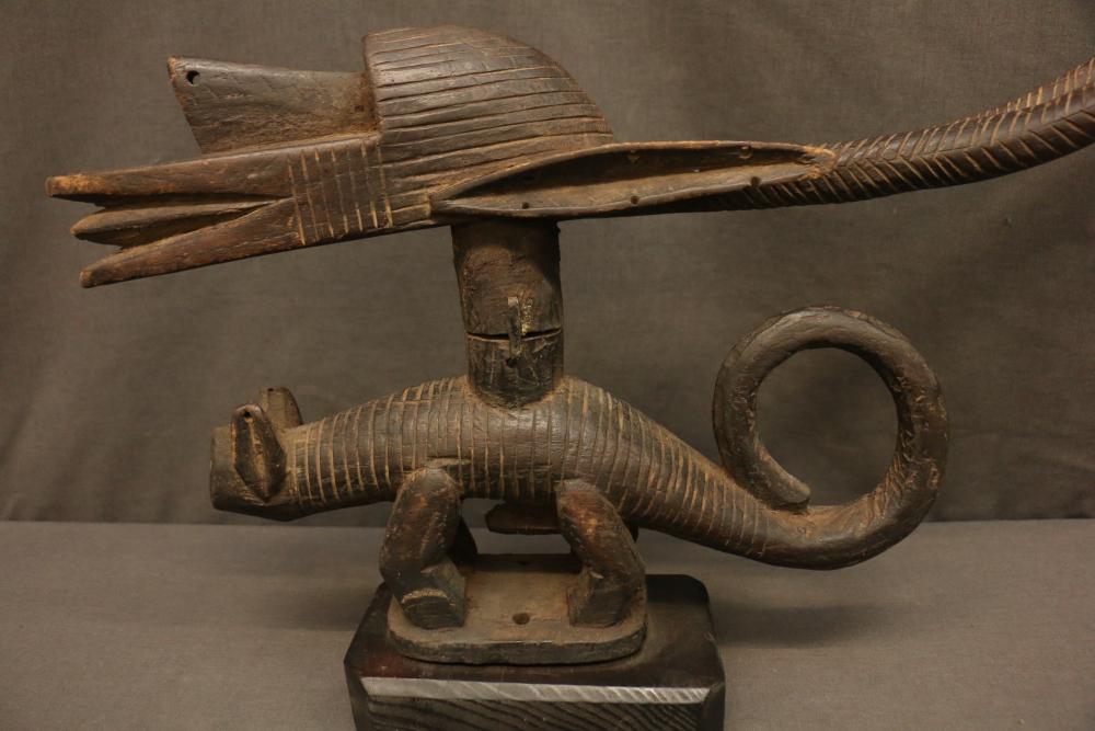 MALE CHI WARA HEAD CREST MASK. Bamana people, Mali. This mask is the mate to the example in Lot # 37. In contrast to the mask in Lot #37 where the body of chi wara is that of an antelope, here the horns of an antelope are combined with elements of a pangolin (curled tail) and aardvark (arched body), both noted for their skill as diggers. This mask is a metaphor for a farmer. Mounted on a custom base. H10.25in. W23.75in. See “Masks from West and Central Africa” by Mary S. and Paul P. Rosen 2013 pp.94-95.