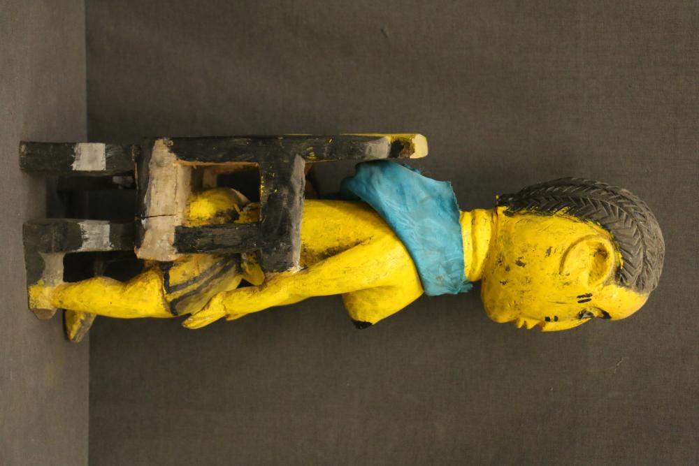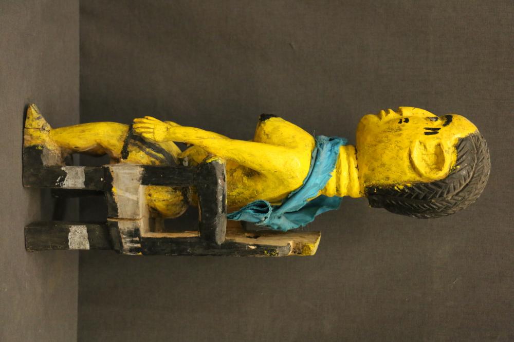 MATERNITY FIGURE. Lokko people, Sierra Leone. Brightly painted figures are typical of Lokko art The authority of the figure is enhanced by placing her on a Western-style high back chair. The scarf adds a dramatic flourish contrasting with her yellow skin. A sculpture such as this would be placed in a woman’s personal altar at home. H 17.5in. Wood, paint, cloth.