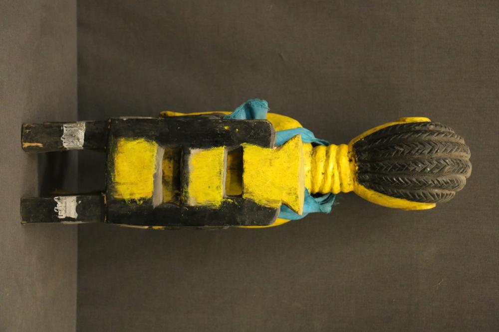 Over 170 lots of African art. Items include women's indigo wraps. Marka/Dafing people, Burkina Faso; Dan headdress, Liberia; large carved Mali-style African drum; old currency spears. Tuareg people, Mali & Niger; rod puppet head of Dankalankule, the Oryx antelope; Bandaka “jellyfish” form currency. Mambila & Chamba people; pendants, Coptic Christian people, Ethiopia; leg band. Mongo & Konda people, Congo; Koranko body mask, Guinea, Sierra Leone; abstract bogolan textile. Bamana people, Mali; ceremonial snake-form bayonet/knife. Lobi people, Burkina Faso; ceremonial blacksmith’s hammer, Northern Nigeria; wedding blanket. Tuareg people, Niger & Mali; West African heddle pulleys. (A) Senufo people, Ivory Coast; maternity figure. Lokko people, Sierra Leone; male Chi Wara head crest mask. Bamana people, Mali; rare Asafo flag bearer/dancer's skirt. Fante people, Ghana & more. Items are located in Pleasant Valley, NY.