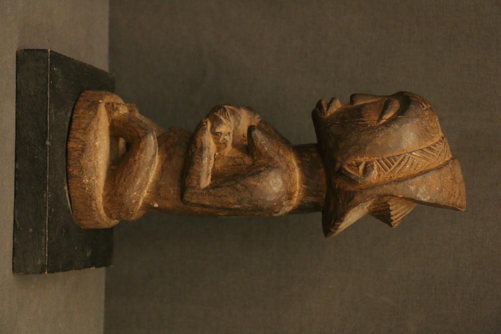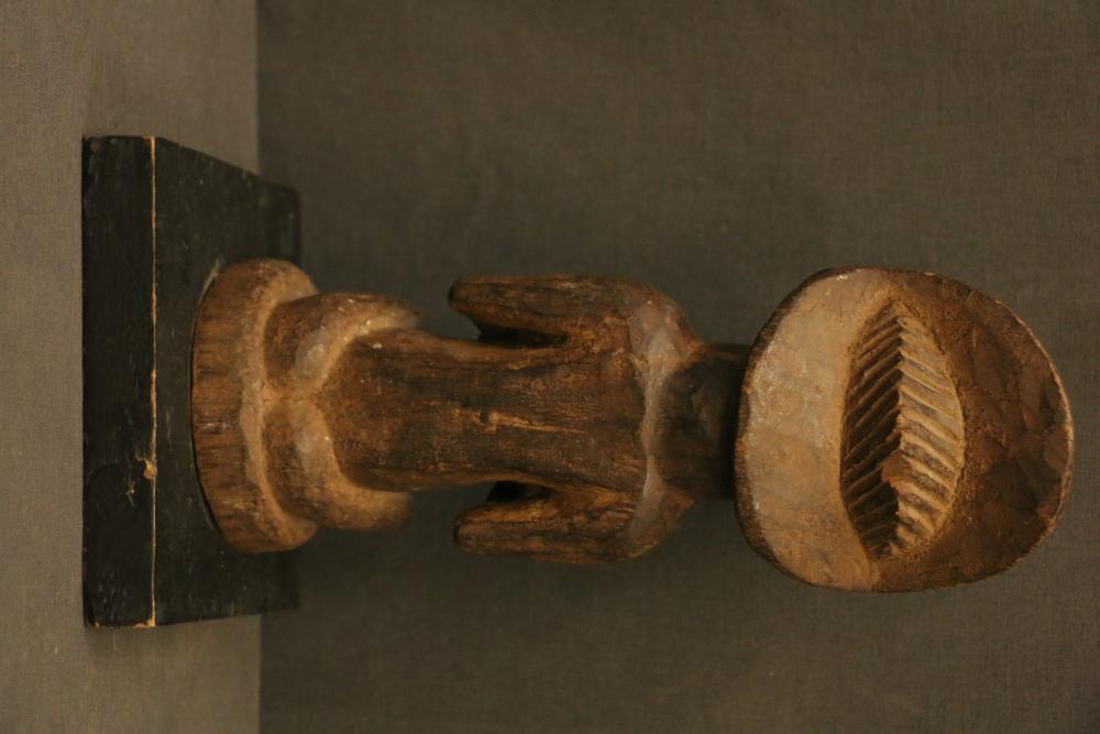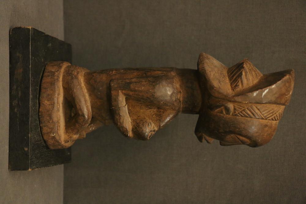 Over 170 lots of African art. Items include women's indigo wraps. Marka/Dafing people, Burkina Faso; Dan headdress, Liberia; large carved Mali-style African drum; old currency spears. Tuareg people, Mali & Niger; rod puppet head of Dankalankule, the Oryx antelope; Bandaka “jellyfish” form currency. Mambila & Chamba people; pendants, Coptic Christian people, Ethiopia; leg band. Mongo & Konda people, Congo; Koranko body mask, Guinea, Sierra Leone; abstract bogolan textile. Bamana people, Mali; ceremonial snake-form bayonet/knife. Lobi people, Burkina Faso; ceremonial blacksmith’s hammer, Northern Nigeria; wedding blanket. Tuareg people, Niger & Mali; West African heddle pulleys. (A) Senufo people, Ivory Coast; maternity figure. Lokko people, Sierra Leone; male Chi Wara head crest mask. Bamana people, Mali; rare Asafo flag bearer/dancer's skirt. Fante people, Ghana & more. Items are located in Pleasant Valley, NY.