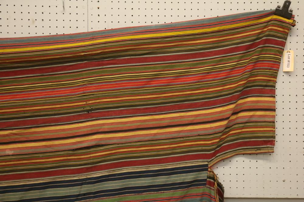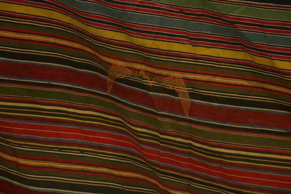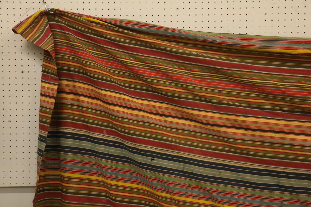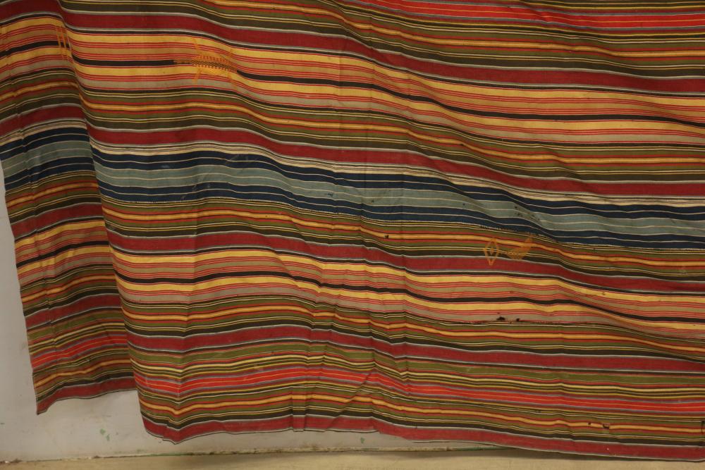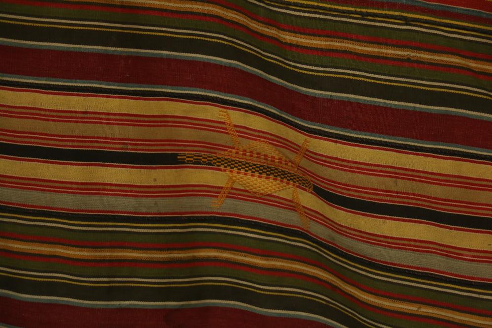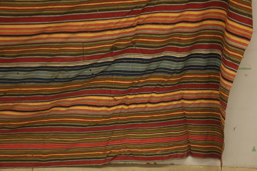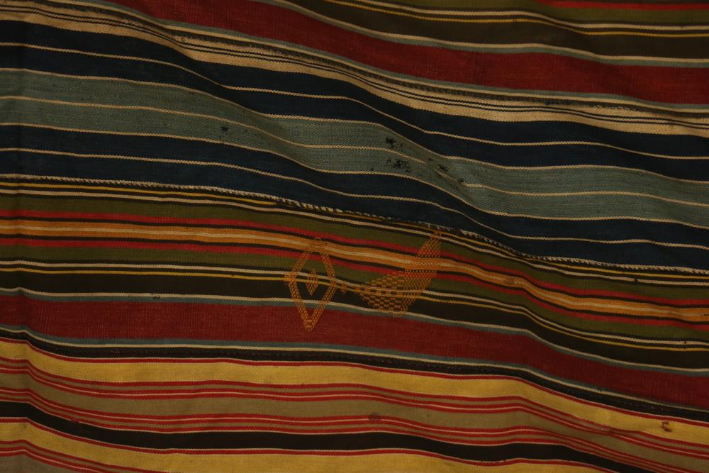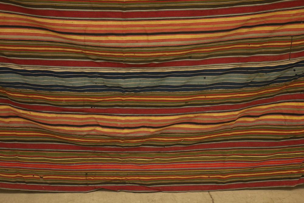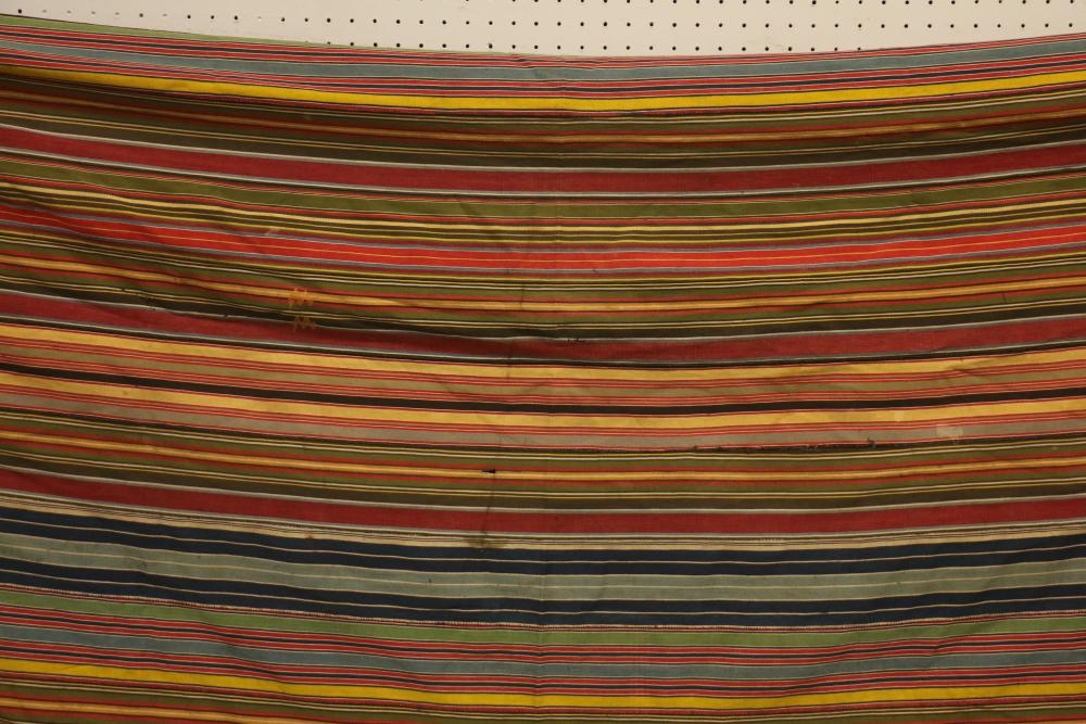 MAN’S ROBE. Ewe people, Ghana. This old man’s wrap was collected in Kpetoe, an important Ewe weaving center, from John Akpoa who stated that it had belonged to his grandfather, Torgbui Kavi and that he had stored it with other important cloth in a box in his home (see Lot #24). Consisting of 20 hand woven, hand sewn strips, it has no weft blocks and only 5 inlay designs or “scriptures” in the warp (one representing a four-legged animal, another a bird in flight, and the others abstract forms). Dating from the early 20th century, this cloth is an excellent example of early Ewe weaving lacking weft blocks. Several different warp strip patterns are represented. Although Ashante cloth is named for its warp stripe designs, this is not a custom with Ewe textiles. Cotton. 77in x 119in.
