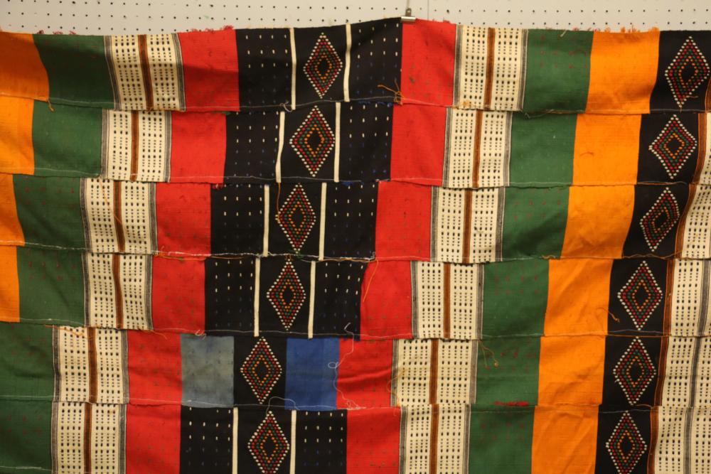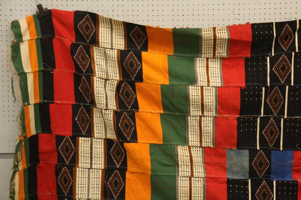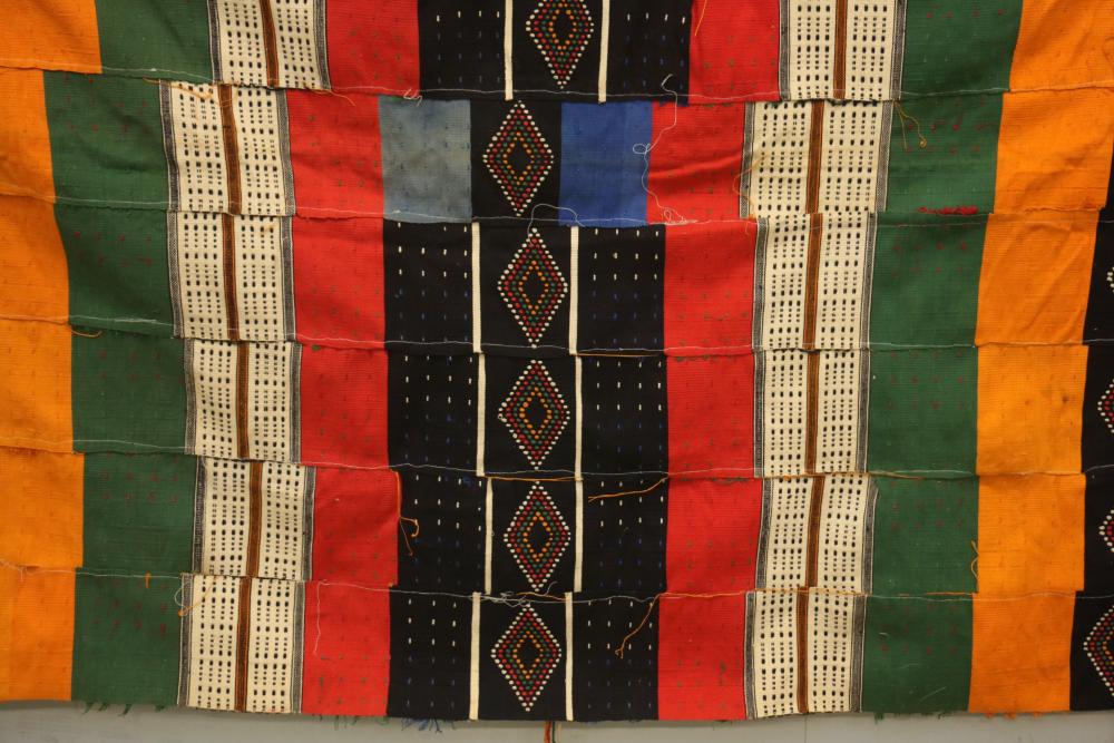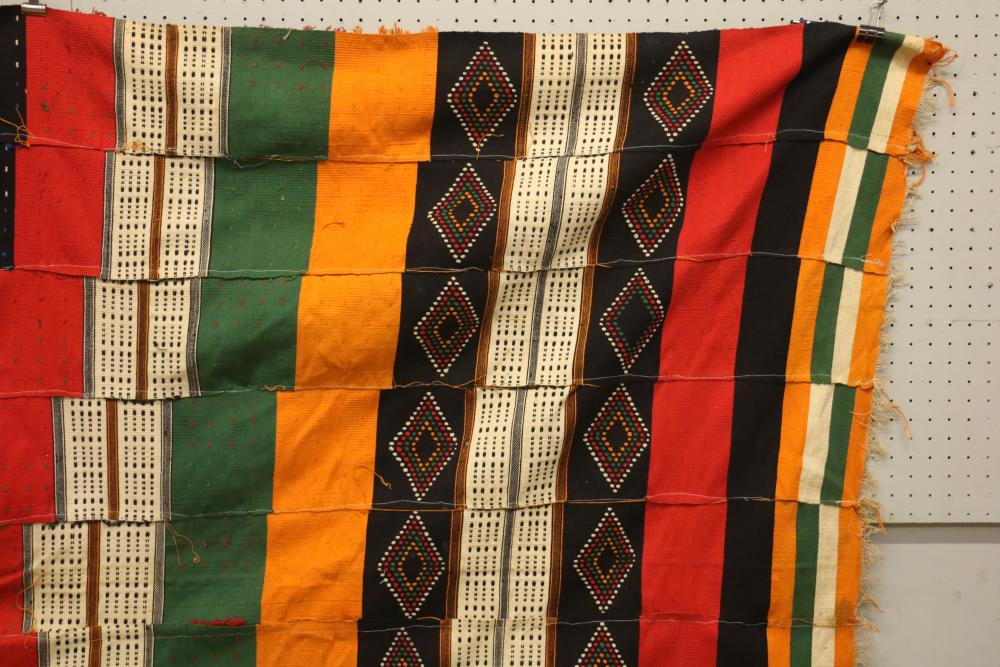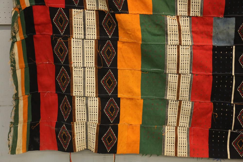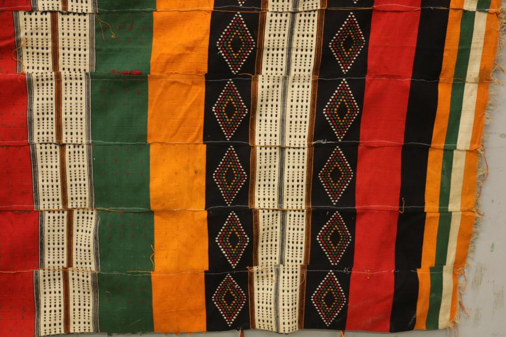 WEDDING BLANKET. Fulani people, Mali or Niger. This exceptional textile consists of 9 hand woven, hand embroidered strips with tufts and tassels. It was given to a newly-wed couple and is used for warmth (nights in the southern Sahara desert can be cold) as well as for protection against wind, sand and insects at night. Cotton. 57in x 108in.