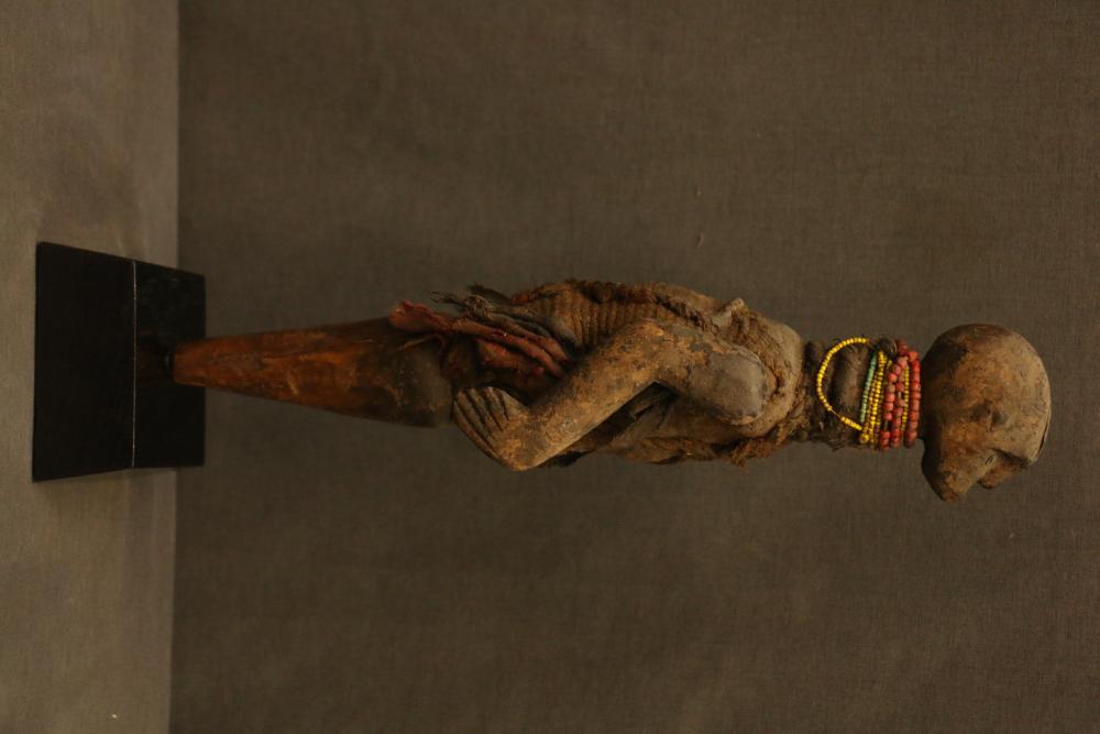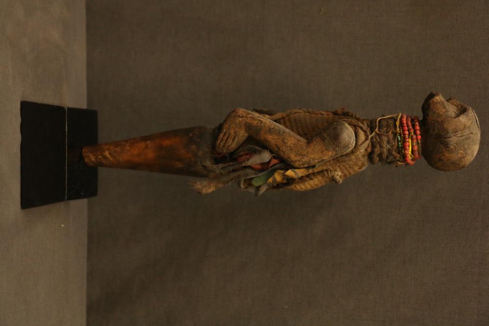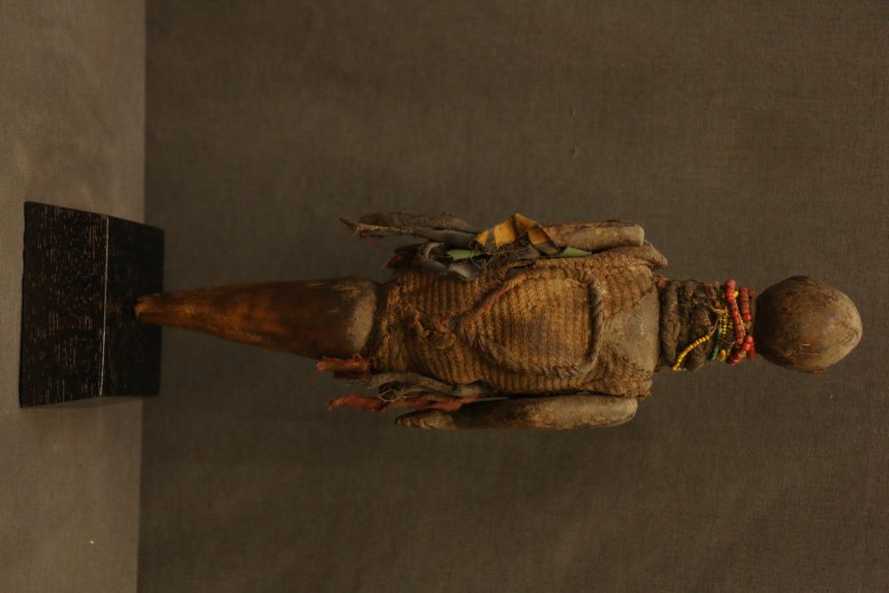 ROD PUPPET. Nyamwezi people, Tanzania. An old puppet such as this was probably used in funerals as a medium for communicating with ancestors. Nails in the eyes and the metal cap would shine during nocturnal torch light ceremonies. The body is wrapped in cloth that holds fetish material in the front and back. On custom base. H 13.5in. Wood, cloth, rope, beads, metal.