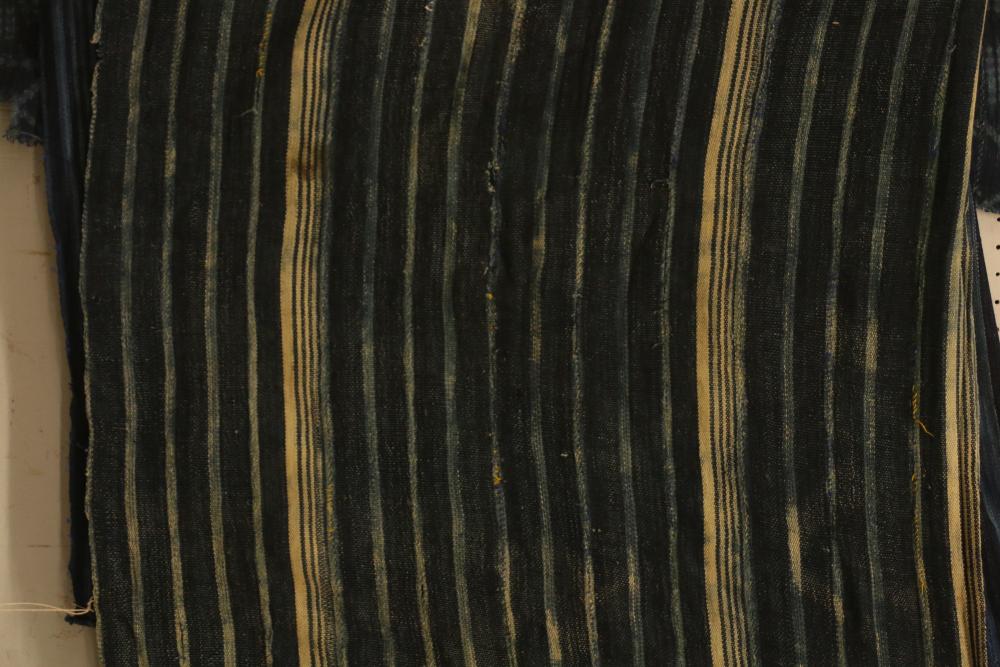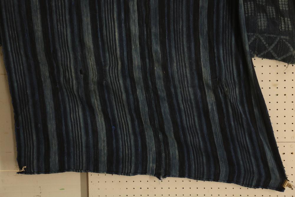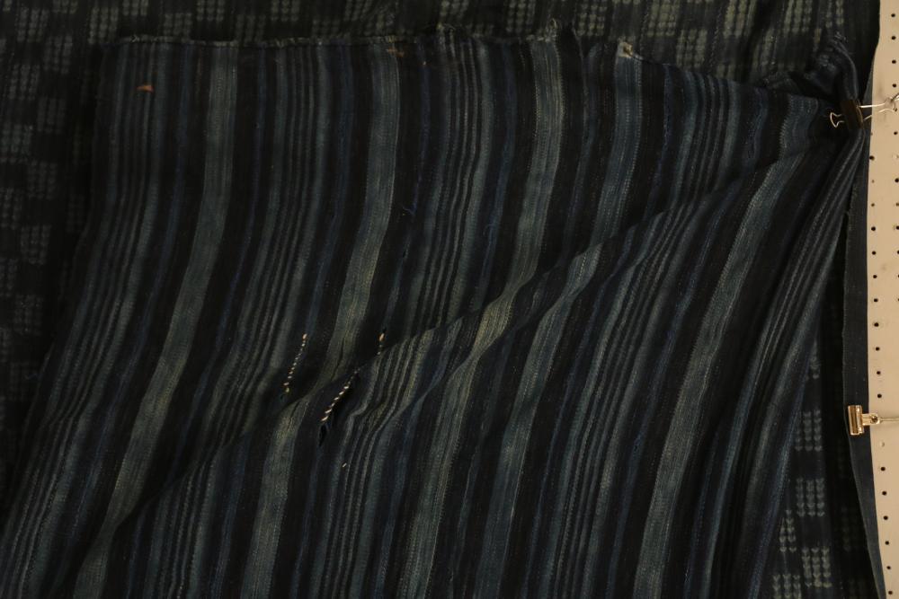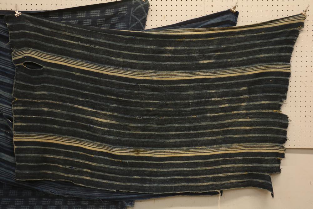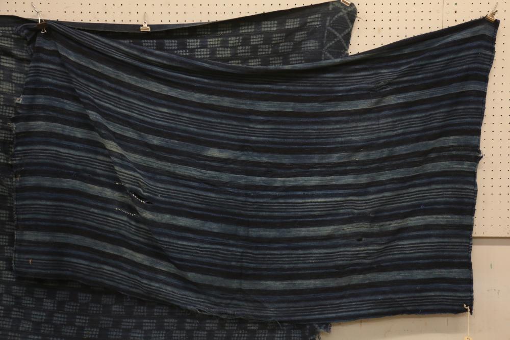 WOMEN’S INDIGO WRAPS (3). Dafing people, Burkina Faso. Made from hand sewn strips hand woven with indigo-dyed cotton yarn. All extremely soft from repeated washing yet retaining vibrant blue color. (A) Design of alternating pale stripes and bands. L 60in. W 36in. (B) Tie dyed block pattern with Xs at ends. L 60in. W 45in. (C) Pale narrow stripes and 2 broad bands. Native repairs. L 55in. W 33in.