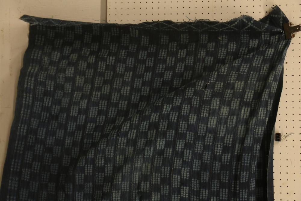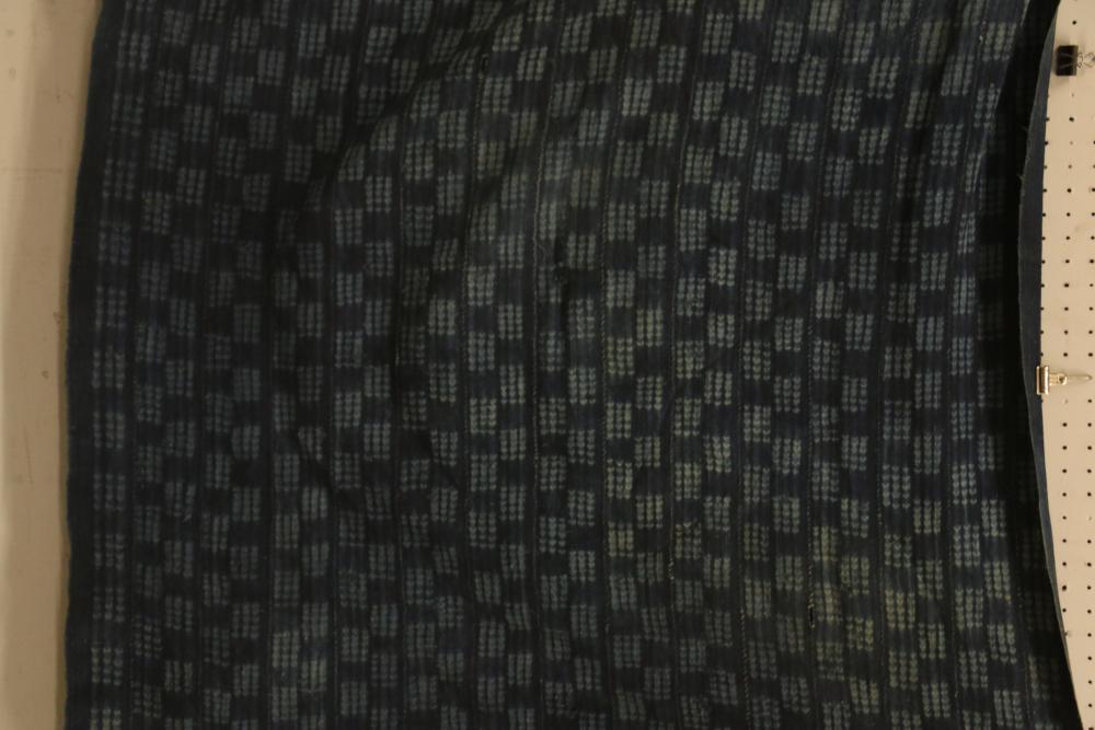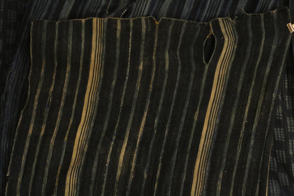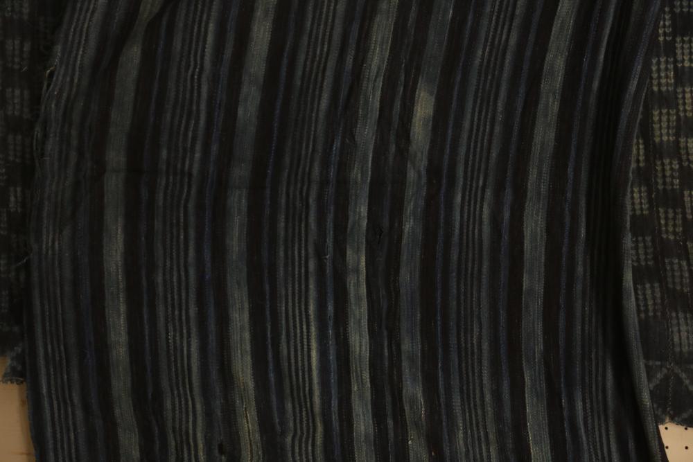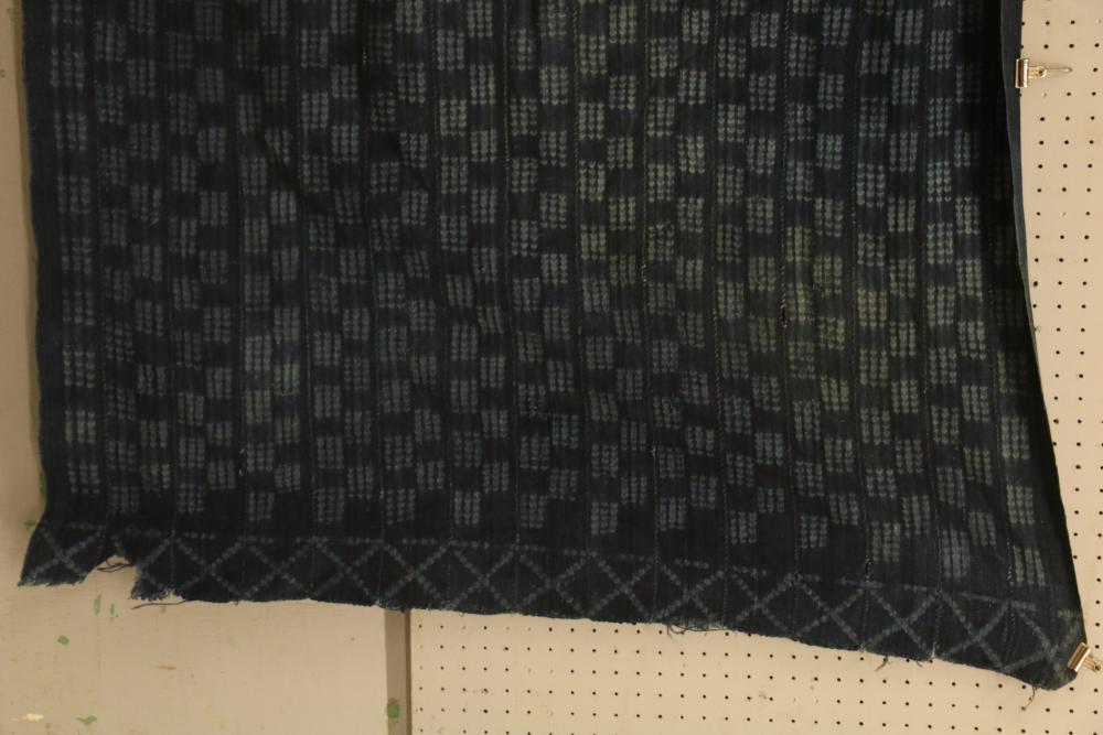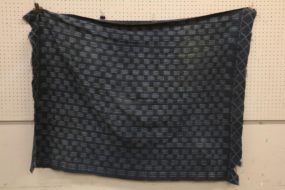 WOMEN’S INDIGO WRAPS (3). Dafing people, Burkina Faso. Made from hand sewn strips hand woven with indigo-dyed cotton yarn. All extremely soft from repeated washing yet retaining vibrant blue color. (A) Design of alternating pale stripes and bands. L 60in. W 36in. (B) Tie dyed block pattern with Xs at ends. L 60in. W 45in. (C) Pale narrow stripes and 2 broad bands. Native repairs. L 55in. W 33in.