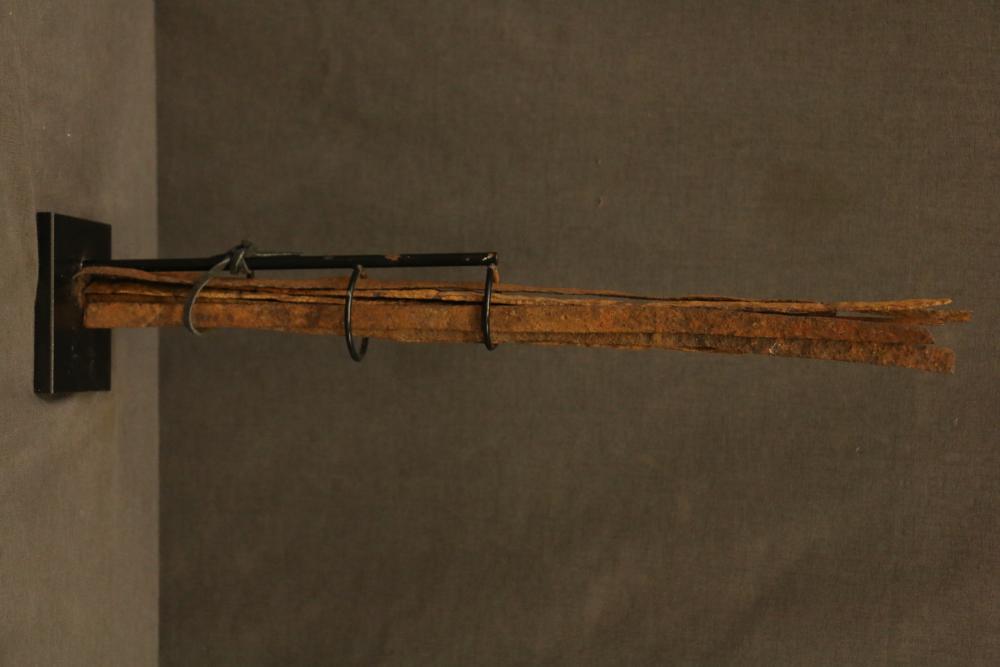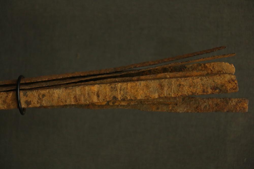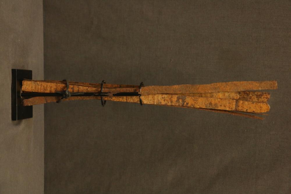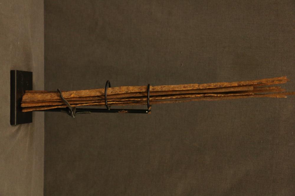 IRON ROD CURRENCY. Ibibio, Efik, and other people in Cross River and Calabar region, Nigeria. These 9 flat rods measuring 13.5in to 16in in length and 3/8 to 5/8in wide date from the 1850s to 1900. All show blacksmith’s hammer marks and were probably traded to natives by Europeans for slaves (female slave worth 10 rods) and used by Africans as currency or to make tools. On custom base. Ex Roberto Ballarini collection, Milan Italy.