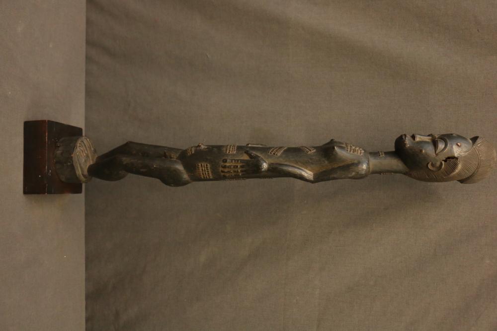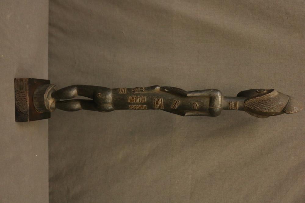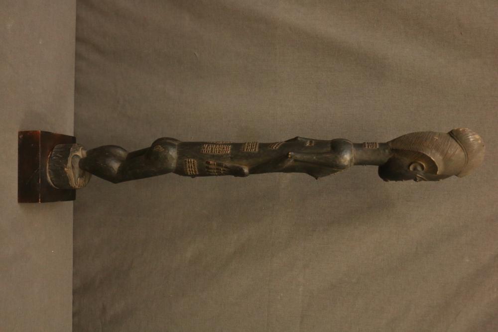 Over 170 lots of African art. Items include women's indigo wraps. Marka/Dafing people, Burkina Faso; Dan headdress, Liberia; large carved Mali-style African drum; old currency spears. Tuareg people, Mali & Niger; rod puppet head of Dankalankule, the Oryx antelope; Bandaka “jellyfish” form currency. Mambila & Chamba people; pendants, Coptic Christian people, Ethiopia; leg band. Mongo & Konda people, Congo; Koranko body mask, Guinea, Sierra Leone; abstract bogolan textile. Bamana people, Mali; ceremonial snake-form bayonet/knife. Lobi people, Burkina Faso; ceremonial blacksmith’s hammer, Northern Nigeria; wedding blanket. Tuareg people, Niger & Mali; West African heddle pulleys. (A) Senufo people, Ivory Coast; maternity figure. Lokko people, Sierra Leone; male Chi Wara head crest mask. Bamana people, Mali; rare Asafo flag bearer/dancer's skirt. Fante people, Ghana & more. Items are located in Pleasant Valley, NY.