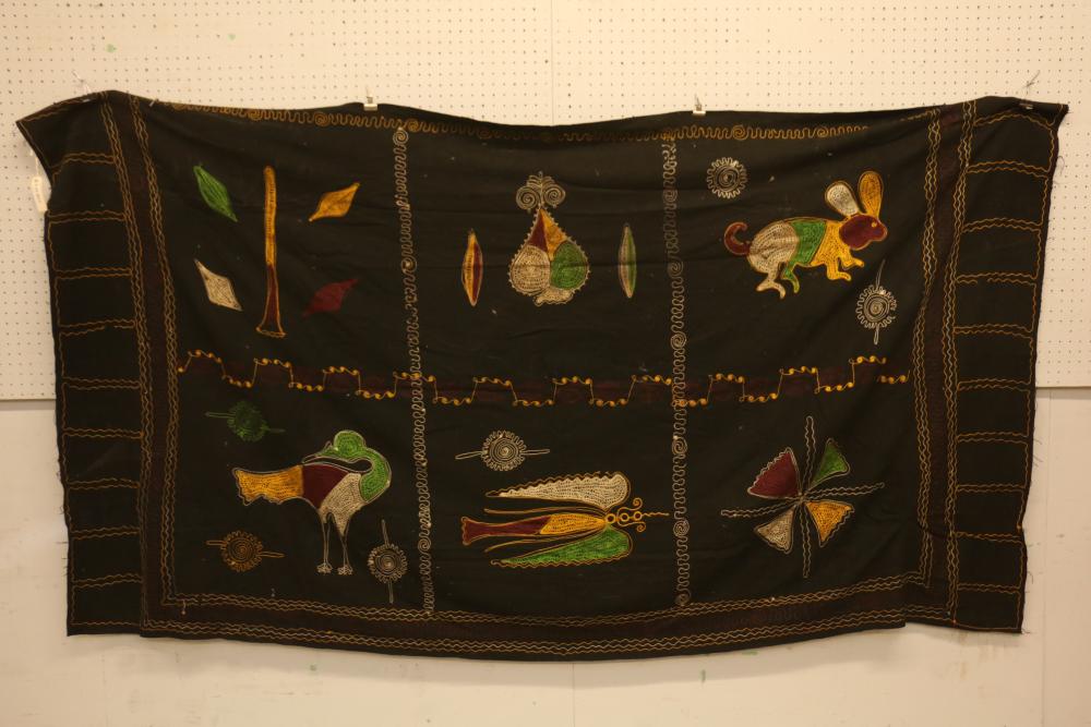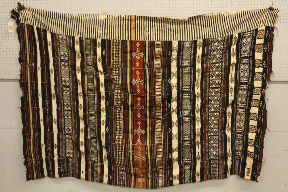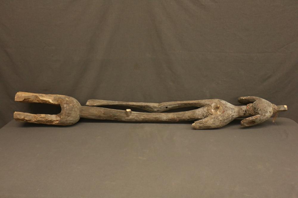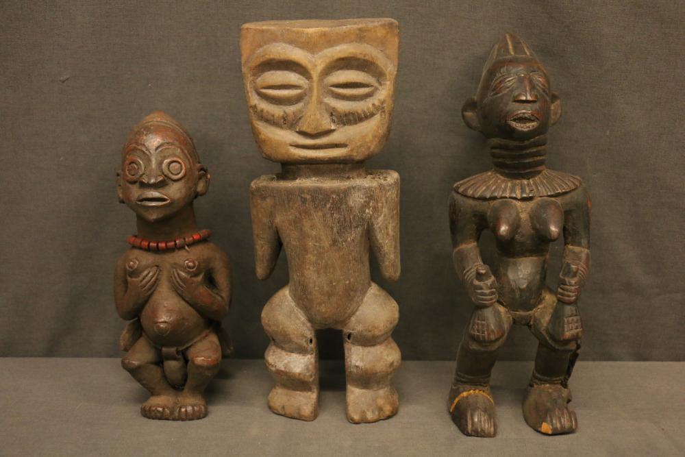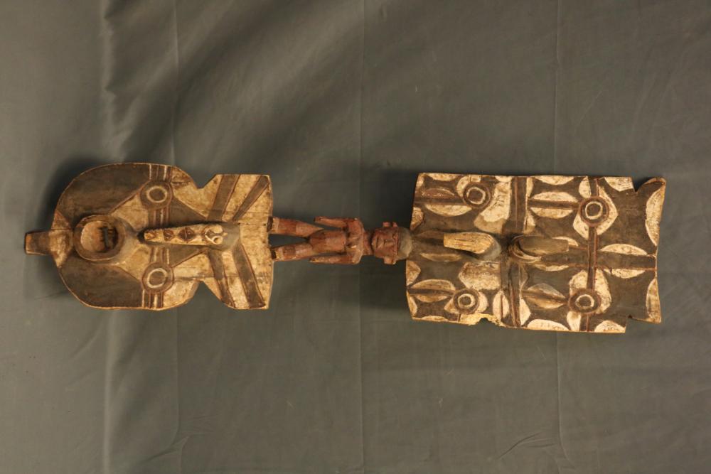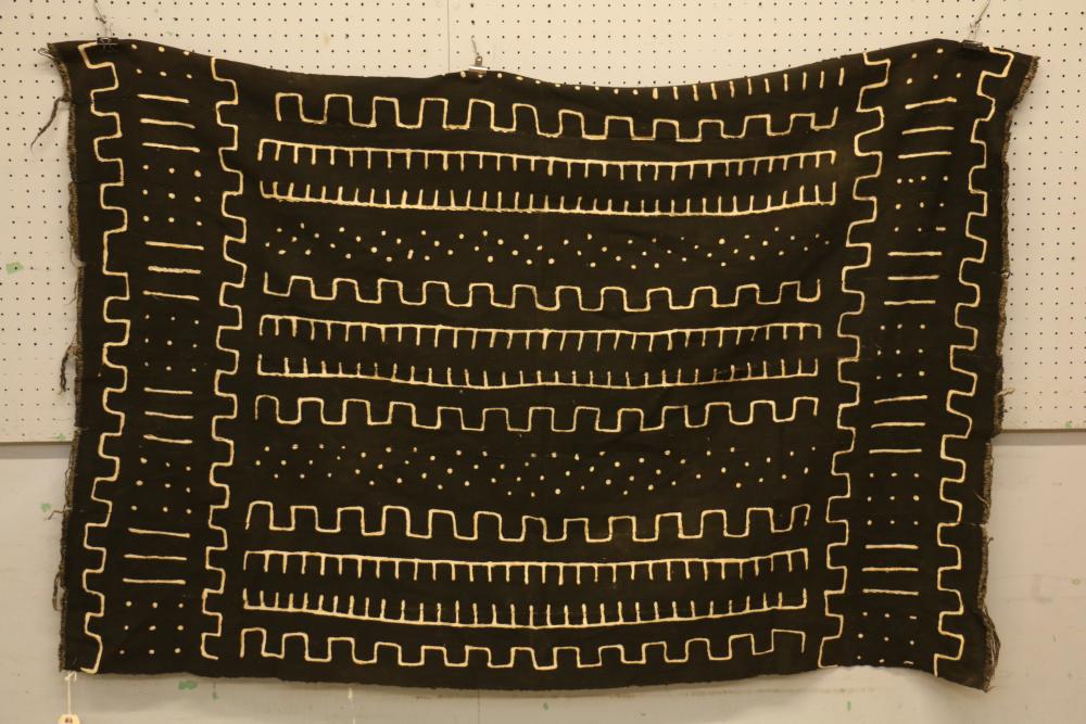 Over 170 lots of African art. Items include women's indigo wraps. Marka/Dafing people, Burkina Faso; Dan headdress, Liberia; large carved Mali-style African drum; old currency spears. Tuareg people, Mali & Niger; rod puppet head of Dankalankule, the Oryx antelope; Bandaka “jellyfish” form currency. Mambila & Chamba people; pendants, Coptic Christian people, Ethiopia; leg band. Mongo & Konda people, Congo; Koranko body mask, Guinea, Sierra Leone; abstract bogolan textile. Bamana people, Mali; ceremonial snake-form bayonet/knife. Lobi people, Burkina Faso; ceremonial blacksmith’s hammer, Northern Nigeria; wedding blanket. Tuareg people, Niger & Mali; West African heddle pulleys. (A) Senufo people, Ivory Coast; maternity figure. Lokko people, Sierra Leone; male Chi Wara head crest mask. Bamana people, Mali; rare Asafo flag bearer/dancer's skirt. Fante people, Ghana & more. Items are located in Pleasant Valley, NY.