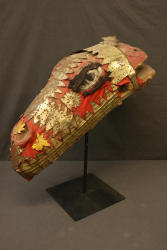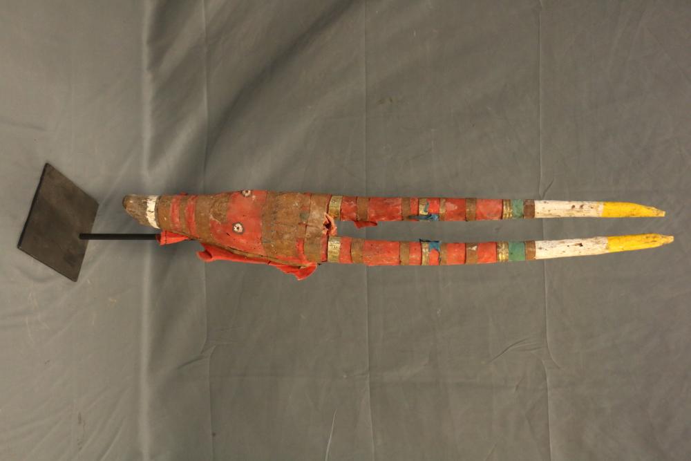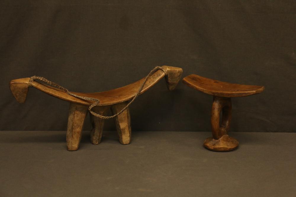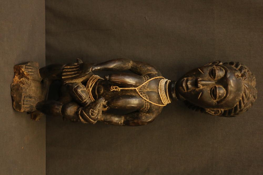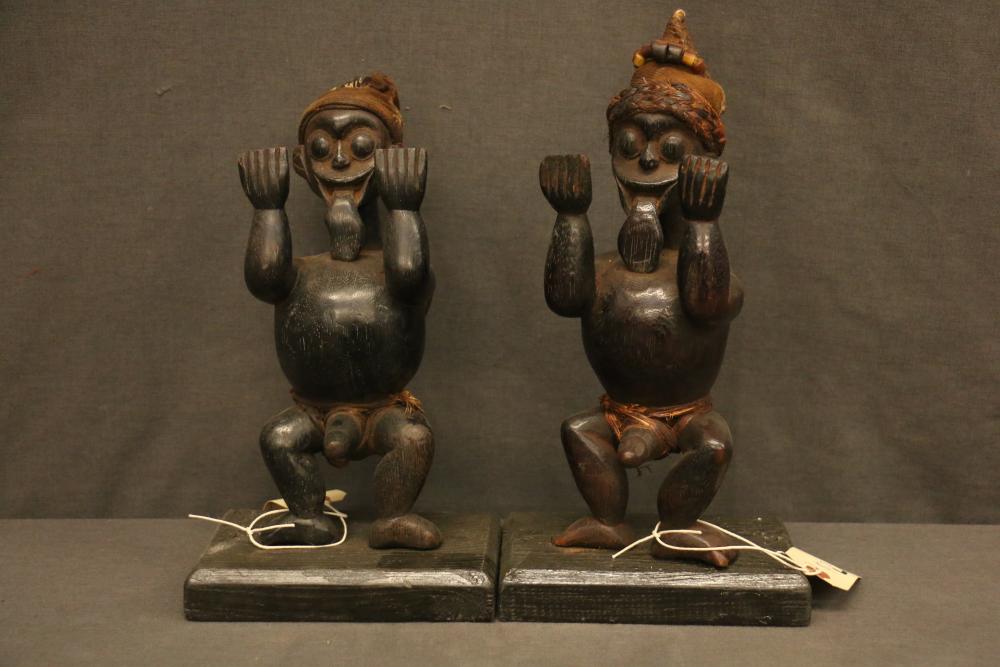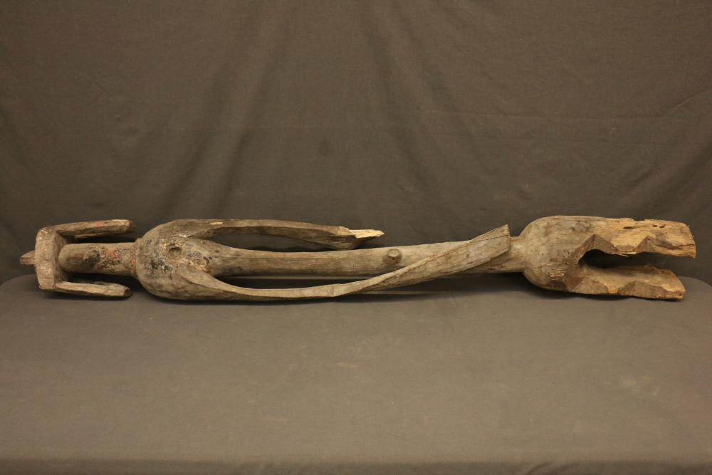 Over 170 lots of African art. Items include women's indigo wraps. Marka/Dafing people, Burkina Faso; Dan headdress, Liberia; large carved Mali-style African drum; old currency spears. Tuareg people, Mali & Niger; rod puppet head of Dankalankule, the Oryx antelope; Bandaka “jellyfish” form currency. Mambila & Chamba people; pendants, Coptic Christian people, Ethiopia; leg band. Mongo & Konda people, Congo; Koranko body mask, Guinea, Sierra Leone; abstract bogolan textile. Bamana people, Mali; ceremonial snake-form bayonet/knife. Lobi people, Burkina Faso; ceremonial blacksmith’s hammer, Northern Nigeria; wedding blanket. Tuareg people, Niger & Mali; West African heddle pulleys. (A) Senufo people, Ivory Coast; maternity figure. Lokko people, Sierra Leone; male Chi Wara head crest mask. Bamana people, Mali; rare Asafo flag bearer/dancer's skirt. Fante people, Ghana & more. Items are located in Pleasant Valley, NY.
