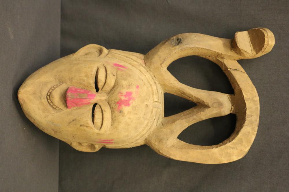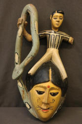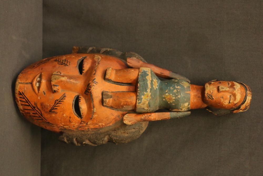 FACE MASK. Anang (Ibibio) people, Nigeria. The man with parted hair seated astride this mask appears to be a European, possibly a celebrity. His identity would be revealed by the dance and accompanying song when it was worn. An interesting but unexplained oddity is the deliberate absence of the man’s feet. The missing left arm and hand probably held a snake. Despite this loss, the mask has an interesting presence. The face has Hindu-inspired features typical of Mami Wata sculptures. The interior shows extensive wear from use. Wood, paint, nails. H 21.5in. Published in Rosen/Rosen 2013 p 146.