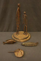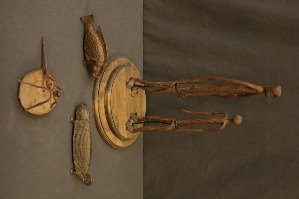 Pair Of Iron Dogon Figures, “Very old,” Mali. Provenance - Exhibition: “Materials Transformed The Art of African Sculpture From the Mary Sue and Paul Peter Rosen Collection.” Free Library Gallery, Philadelphia, PA 2012, Iron oil lantern dogon mali, Solid Cast Brass, The Nile Perch or Capitane, Ivory Coast, & Brass Chameleon, “Unusual.” handcast with traditional decoration depicting water, Mali. Largest being 18.5" tall.