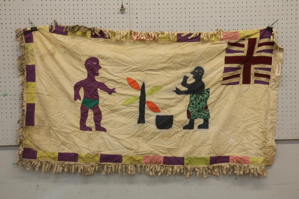 Asafo Militia flag depicting a Chief in a patterned robe pointing to an odum tree which is the source of his spiritual powers and authority. A member of the Asafo Company is looking on. Message: All members of the Company are protected by the Chief. Proverb: A Chief is like an odum tree; he has no front or back (he is responsible for everyone). The canton is an unusual modification of the Union Jack. The figures are hand sewn with embroidered details. Cotton textile. 59.5in. X 30.5in.