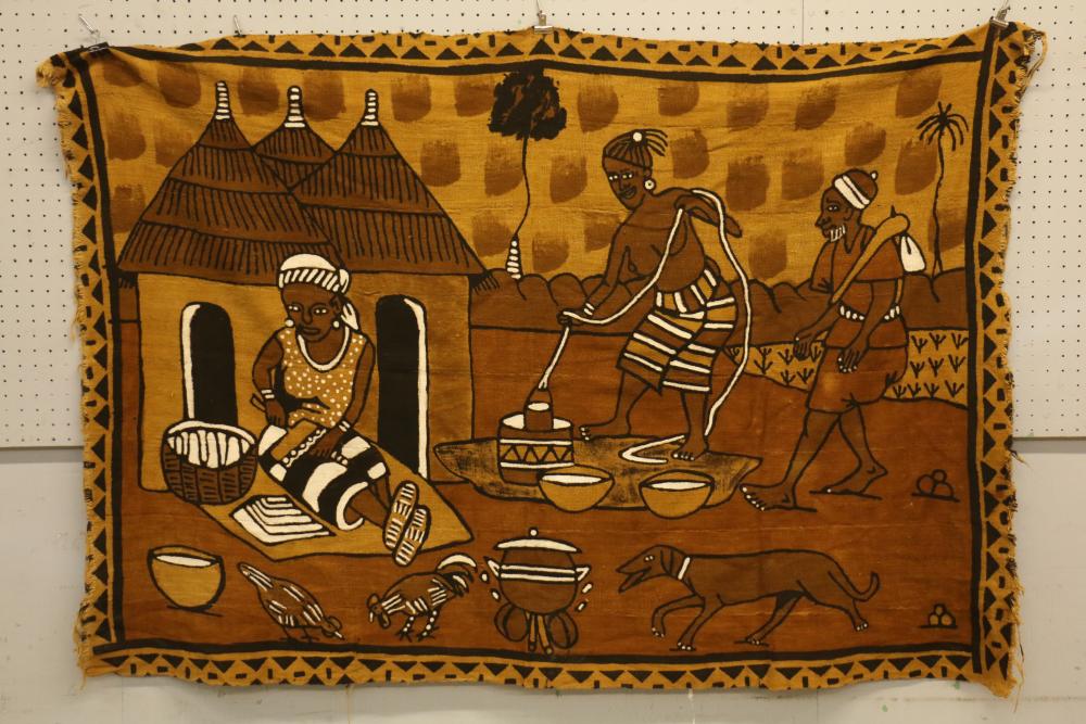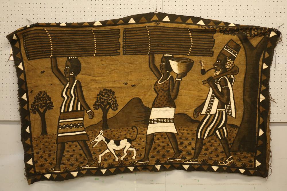 PICTORIAL BOGOLAN TEXTILE. Bamana people, Mali. This domestic scene depicts three generations. A farmer smoking a pipe and with a hoe on one shoulder is accompanied by his dog as he returns from his fields. An elder man smoking a pipe, probably the farmer’s father, is seated under a tree as the farmer’s wife with a baby in a sling on her back is preparing a meal. L 86in. W 42in. Hand painted, hand woven cotton textile.