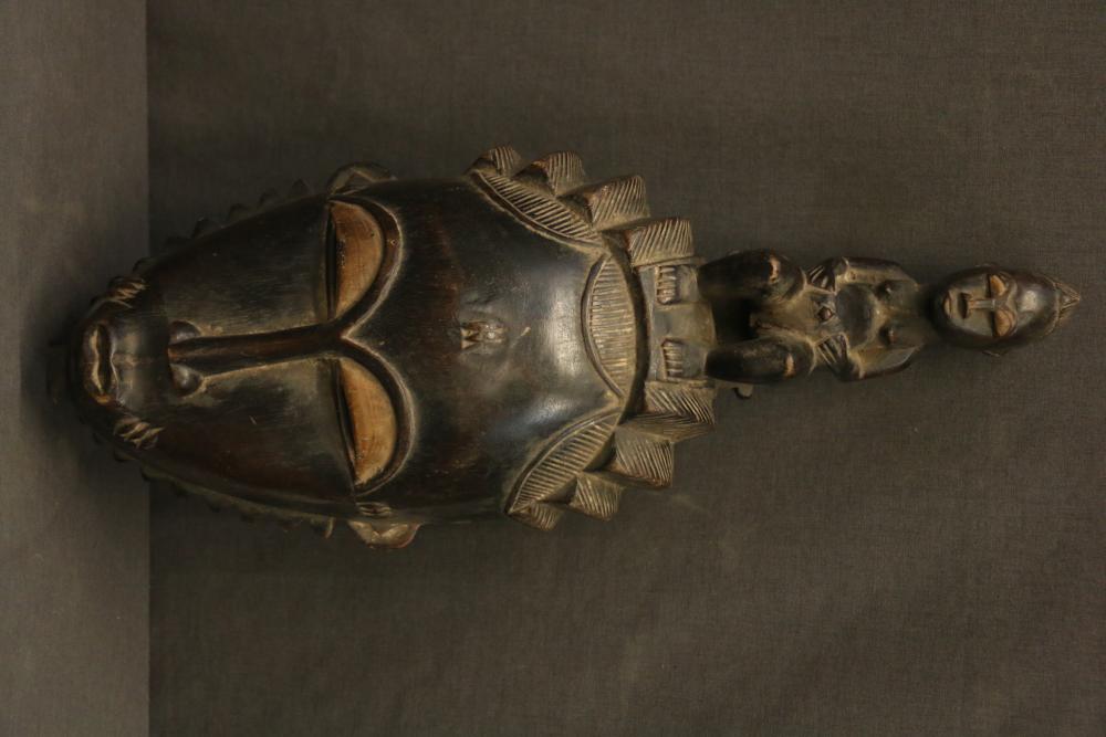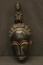NDOMA FEMALE PORTRAIT FACE MASK. Baule people, Ivory Coast. These masks appear at daytime entertainment events to celebrate the image of an ideal woman. This mask is exceptional for two reasons. 1. Whereas the coiffure of the typical portrait mask has three lobes with the one in the center being larger, here the larger central lobe is flanked by three lobes of decreasing size cascading down each side. 2. Objects depicted on the coiffure are typically combs, birds, or animal horns and only rarely by human figures. Here the mask is topped by a woman seated on a traditional stool. Her serene visage complements the face of the mask and her arms resting on her abdomen are a sign of peace. H17.5in. W6.5in. Wood, pigment.