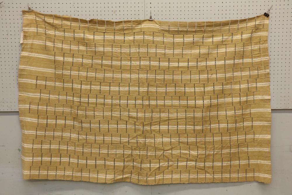 WOMAN’S ASO OKE CEREMONIAL CLOTH. Yoruba people, Nigeria. This traditional cloth of 13 hand woven strips was made from cotton and glittering Japanese metalized Lurex plastic thread. The outside surface of the cloth is covered with warp float decorations. Gaps in the cloth were made by placing a weaver’s sword among the warp threads. The gaps allow for ventilation. L 71in W 43in. See Clarke 1997 p94-111.