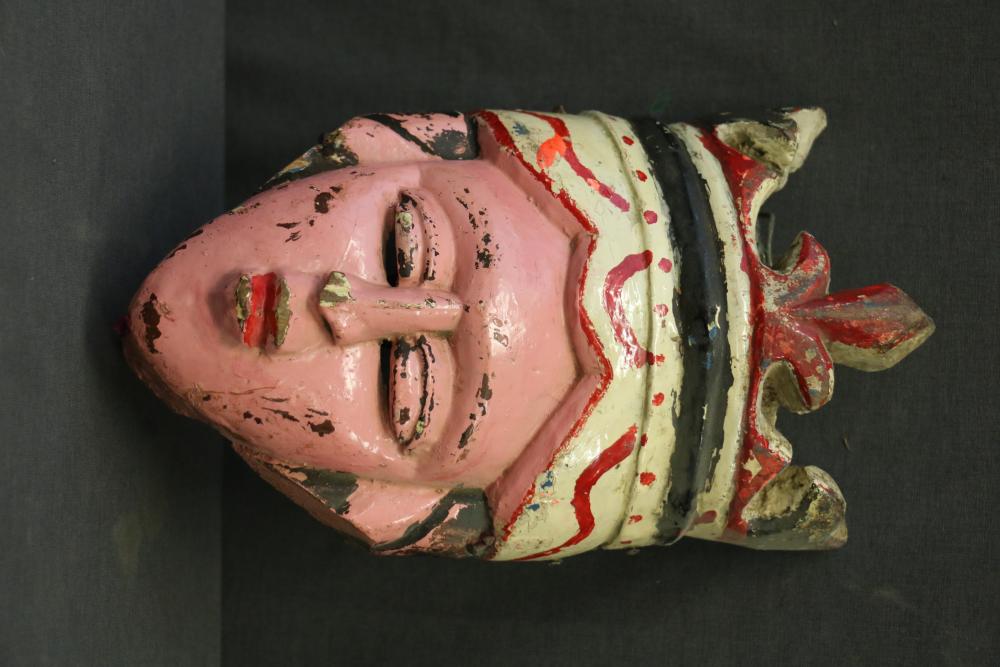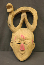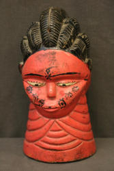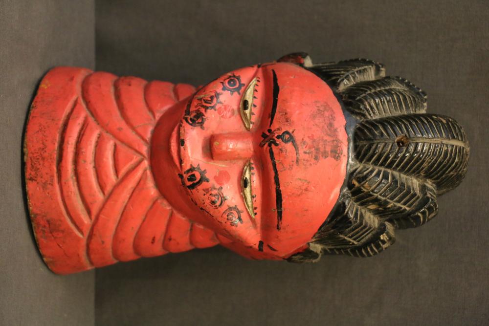 FACE MASK. Temne people, Sierra Leone. This mask was worn at a Jolly Society celebration. It is part of an elaborate “fancy” costume that was attached to the mask with nails and was supported by a wire armature that is now folded inside the mask. The mask depicts a royal person but the intended message can only be known from songs and music at the performance. H 11in. Wood, paint, nails, wire. See Rosen, Rosen 2013 p.58-59.