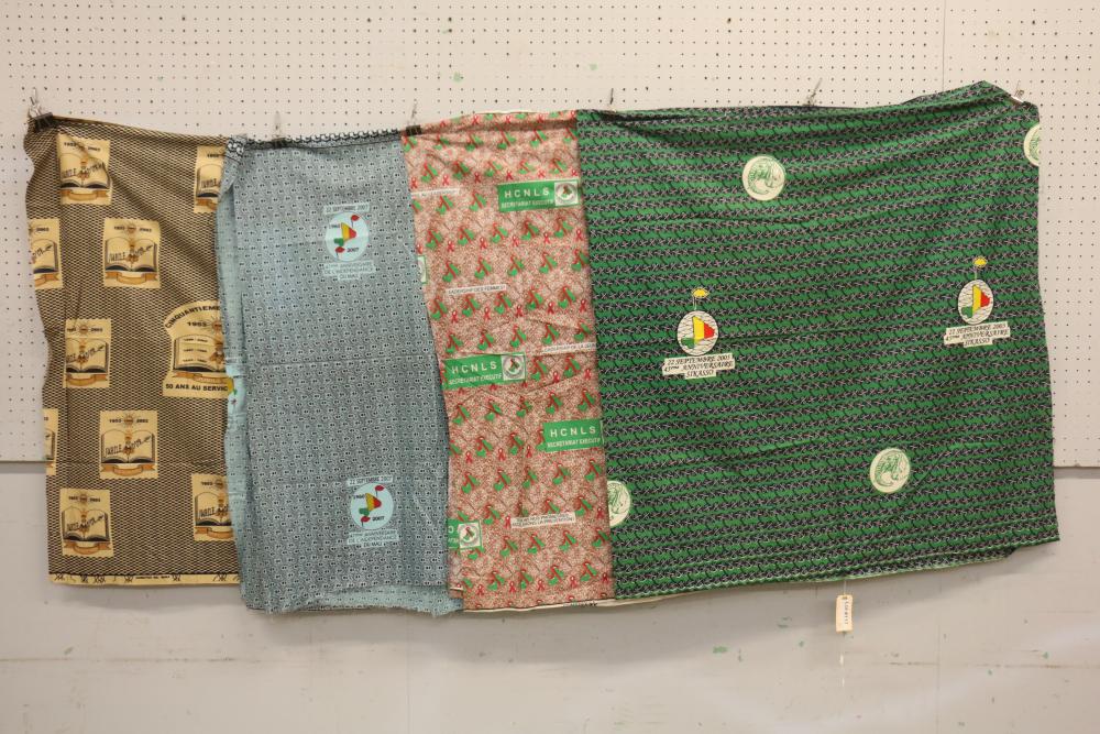COMMEMORATIVE CLOTHS (4). Mali. (A) Green cloth with elephants commemorates the 45th anniversary of Mali’s independence on September 22, 2005 in the city of Sikasso. L 77in. W 42in. (B) Cloth with red ribbons commemorates the leadership of women and youth in the fight against HIV/AIDS (sida in French) L 71in. W 44in. (C) Blue cloth commemorates the independence of Mali on September 22, 2007. L 140in. W 44in. (D) Beige cloth with black dots that commemorates the 50th anniversary in 2003 of three high schools (lycee) for girls in Mali: Lycee Nelson Mandela, Lycee National, and Cours Normal. L 71in. W 42in. All printed on cotton cloth by Comatex SA Mali, the national textile manufacturer. Length of cloths (A), (B), and (D) is one pagne, a standard unit of measure for length. Cloth (C) is 2 pagnes. Textiles such as this are used by women to sew their clothing.